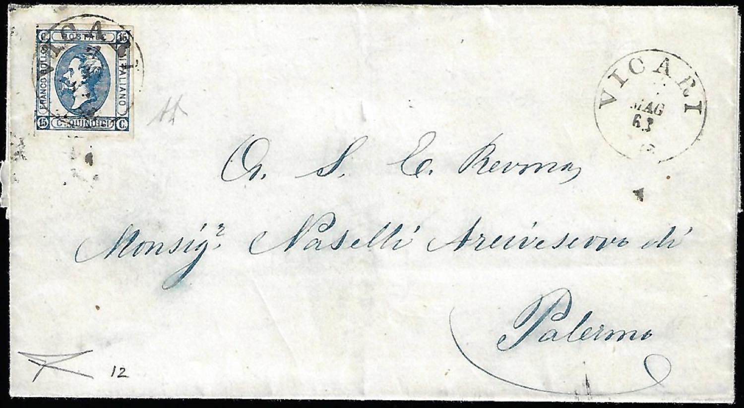 VICARI, punti 8 - 15 cent. Litografico (12), perfetto, su sovracoperta di lettera del 17/5/1863 per Palermo. A.Diena, Bottacchi.