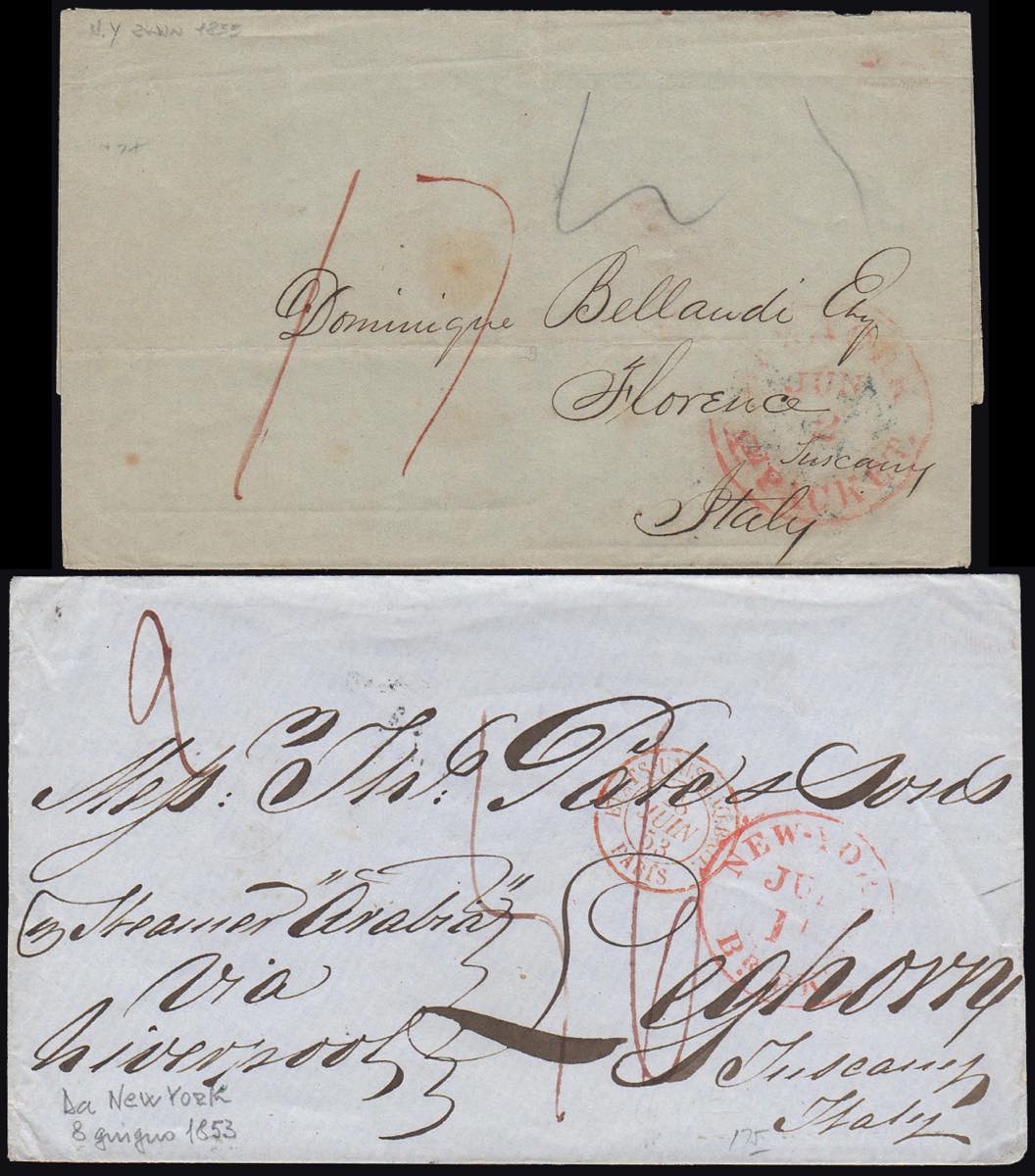 INCOMING MAIL STATI UNITI 1853/55 - Una busta e una sovracoperta di lettera, entrambe non affrancate, spedite da New York alla Toscana, ... Read more