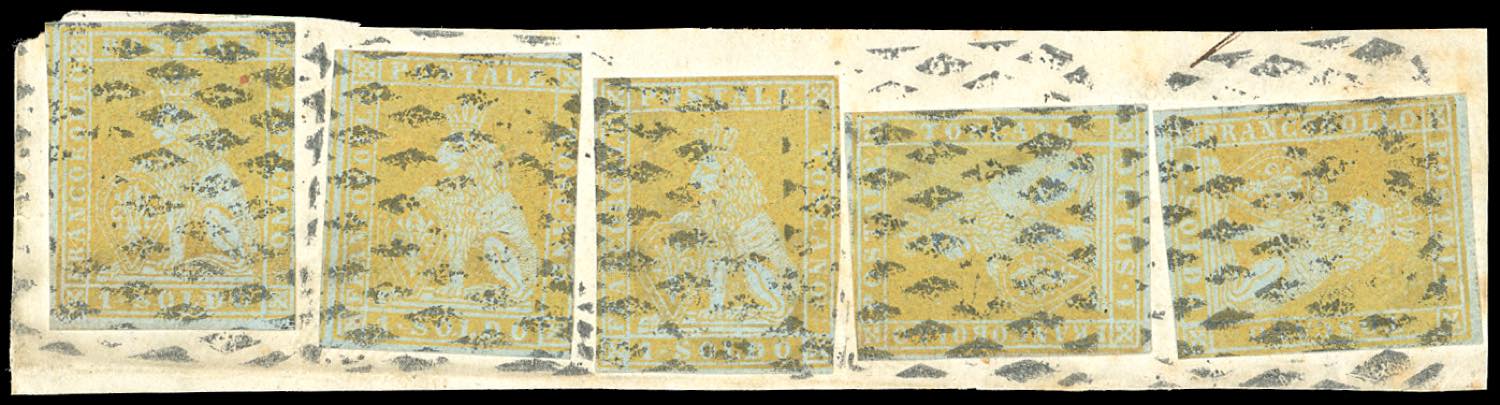 1851 - 1 soldo giallo oro su azzurro (2c), cinque esemplari, alcuni margini intaccati, usati su frammento. Rarissima affrancatura multipla ... Read more