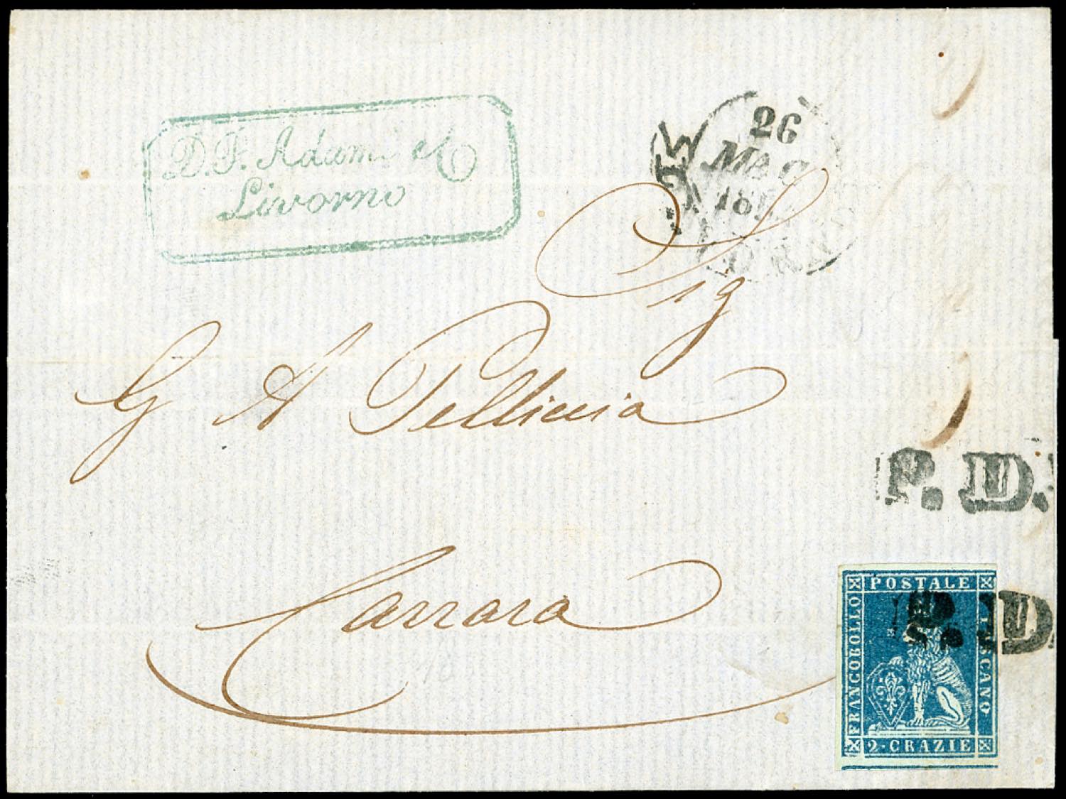 1854 - 2 crazie azzurro su grigio (5d), tre ottimi margini, intaccato a destra, su fresca sovracoperta di lettera da Livorno 26/5/1854 a Carrara. Pregevole tariffa "limitrofa" per il Ducato di Modena.