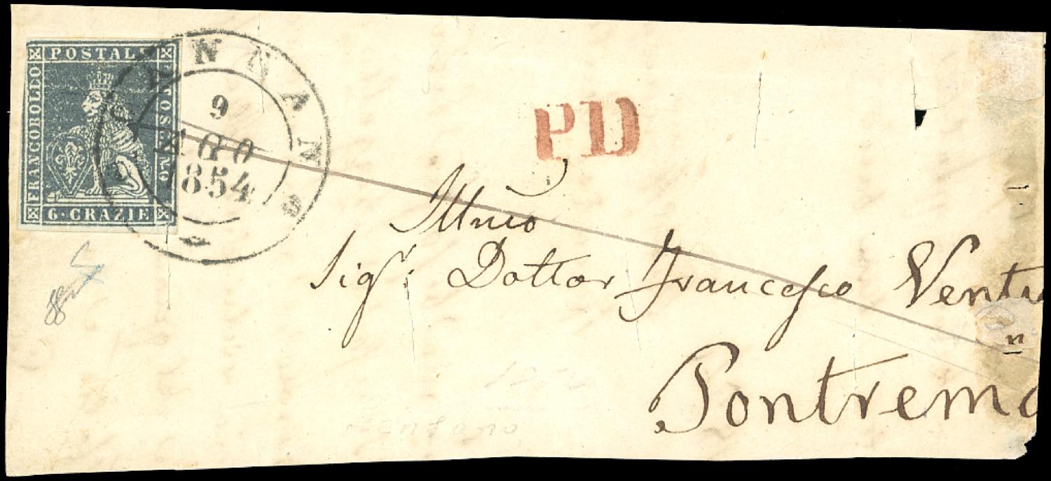 1854 - 6 crazie ardesia su grigio (7), difettoso, su frontespizio di lettera da Scansano 9/8/1854 per Pontremoli, tagli di disinfezione. ... Read more