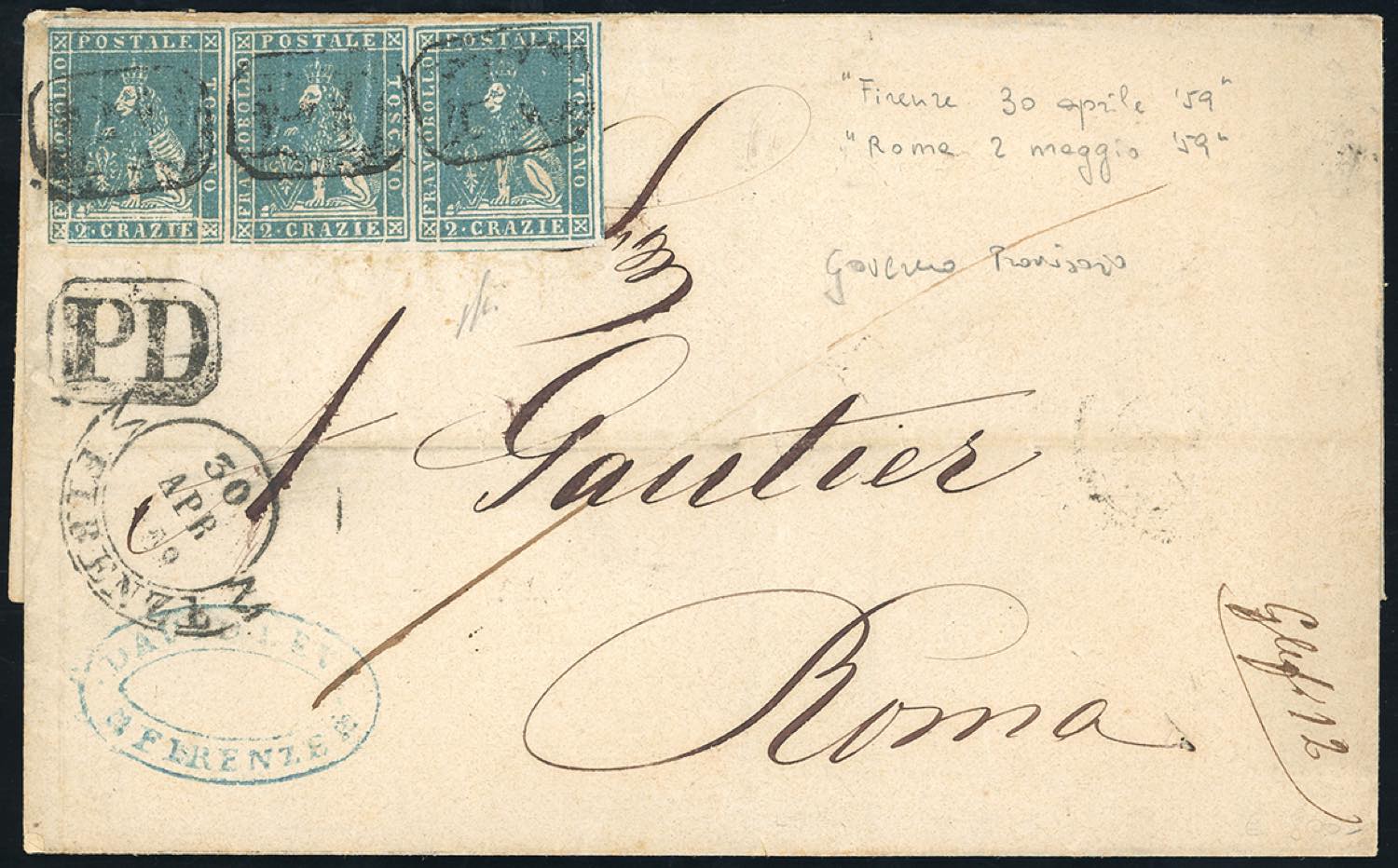 1859 - 2 crazie azzurro (13), striscia orizzontale di tre, tre ottimi margini, sfiorata a sinistra, su lettera da Firenze 30/4/1859 a Roma. Interessante lettera dei primissimi giorni del Governo Provvisorio. Rara. Cert. Avi.