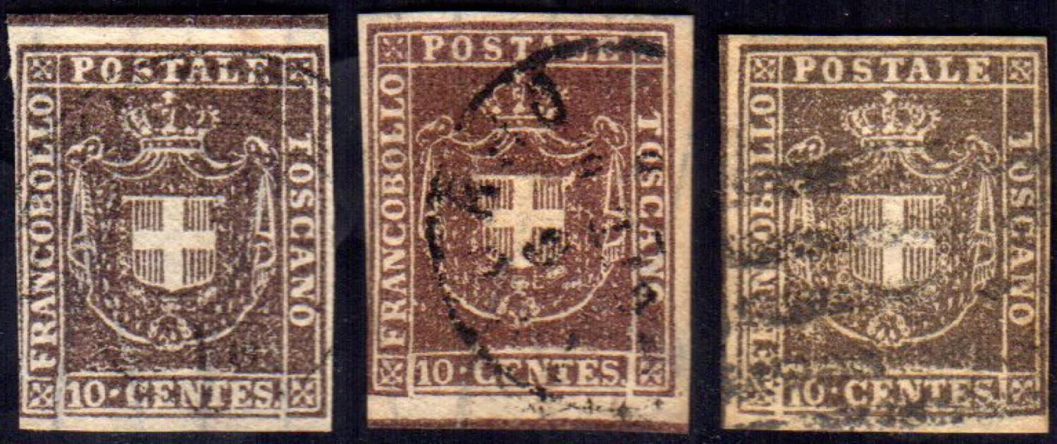 1860 - 10 cent., tre esemplari, tinte differenti, con linea di riquadro in alto, in basso e a sinistra (19g,19i,19k), usati.