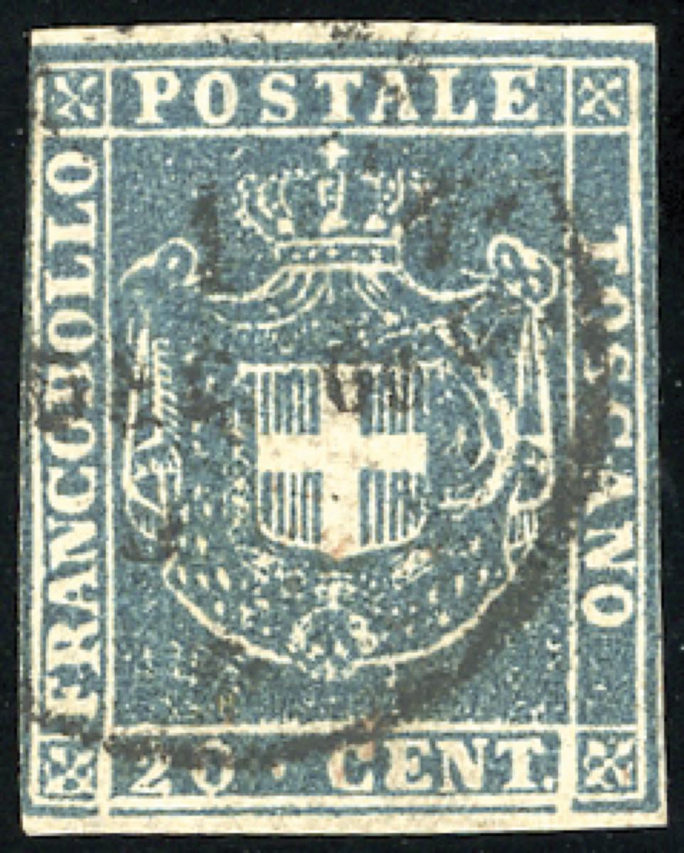 1860 - 20 cent. azzurro (20), due ottimi margini orizzontali, sfiorato a sinistra, usato a Livorno 1/1/1860, PRIMO GIORNO D'EMISSIONE. ... Read more