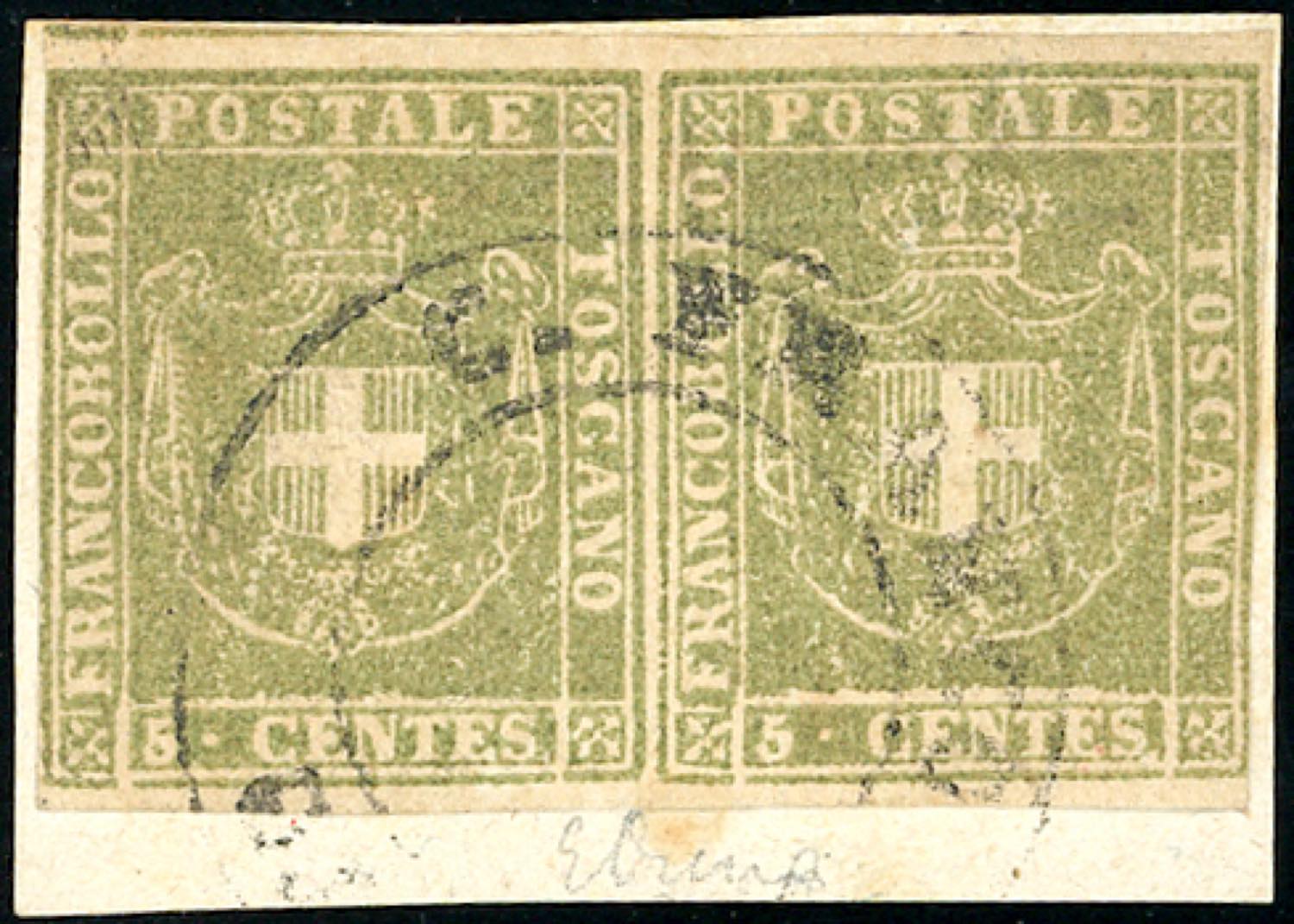 CASTELFRANCO DI SOTTO, punti 13 - 5 cent. verde oliva (18a), coppia sfiorata a destra su piccolo frammento. Rara. Emilio Diena, Ferrario.