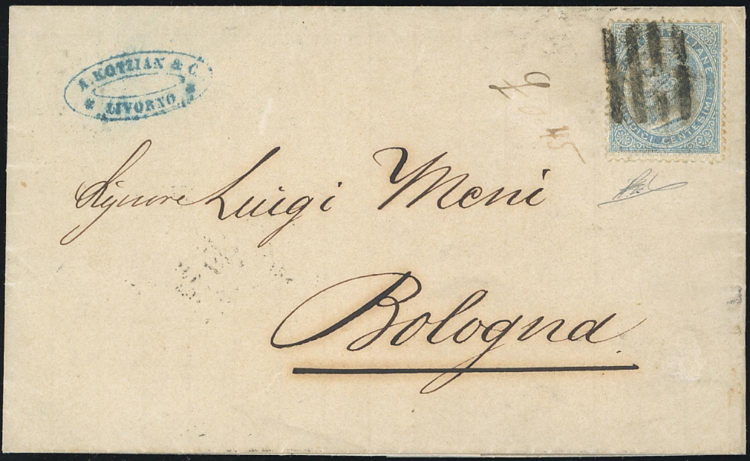 PISTOIA, muto a 4 sbarre punti 11 - 15 cent. De La Rue (Regno L18), perfetto, su sovracoperta di lettera da Livorno a Bologna 20/4/1864, ... Read more