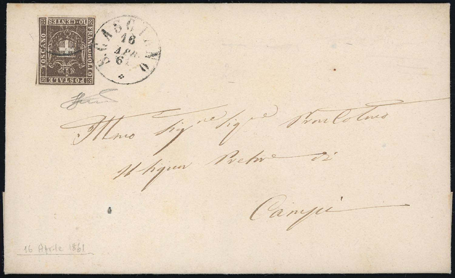 S. CASCIANO, cerchio semplice medio punti 12 - 10 cent. (19), margini completi, su sovracoperta di lettera del 16/4/1861 a Campi. Ferrario.