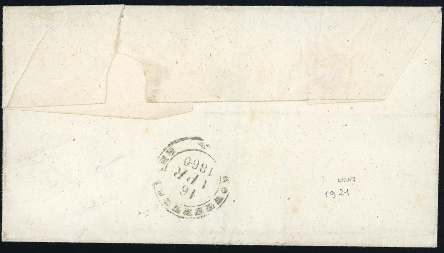 SORANO, muto a sigillo ben leggibile punti R1 - 10 cent. (19), leggermente intaccato in un punto a destra, su sovracoperta di lettera del 14/4/1860 a Montepulciano. Raro così nitido. E.Diena.