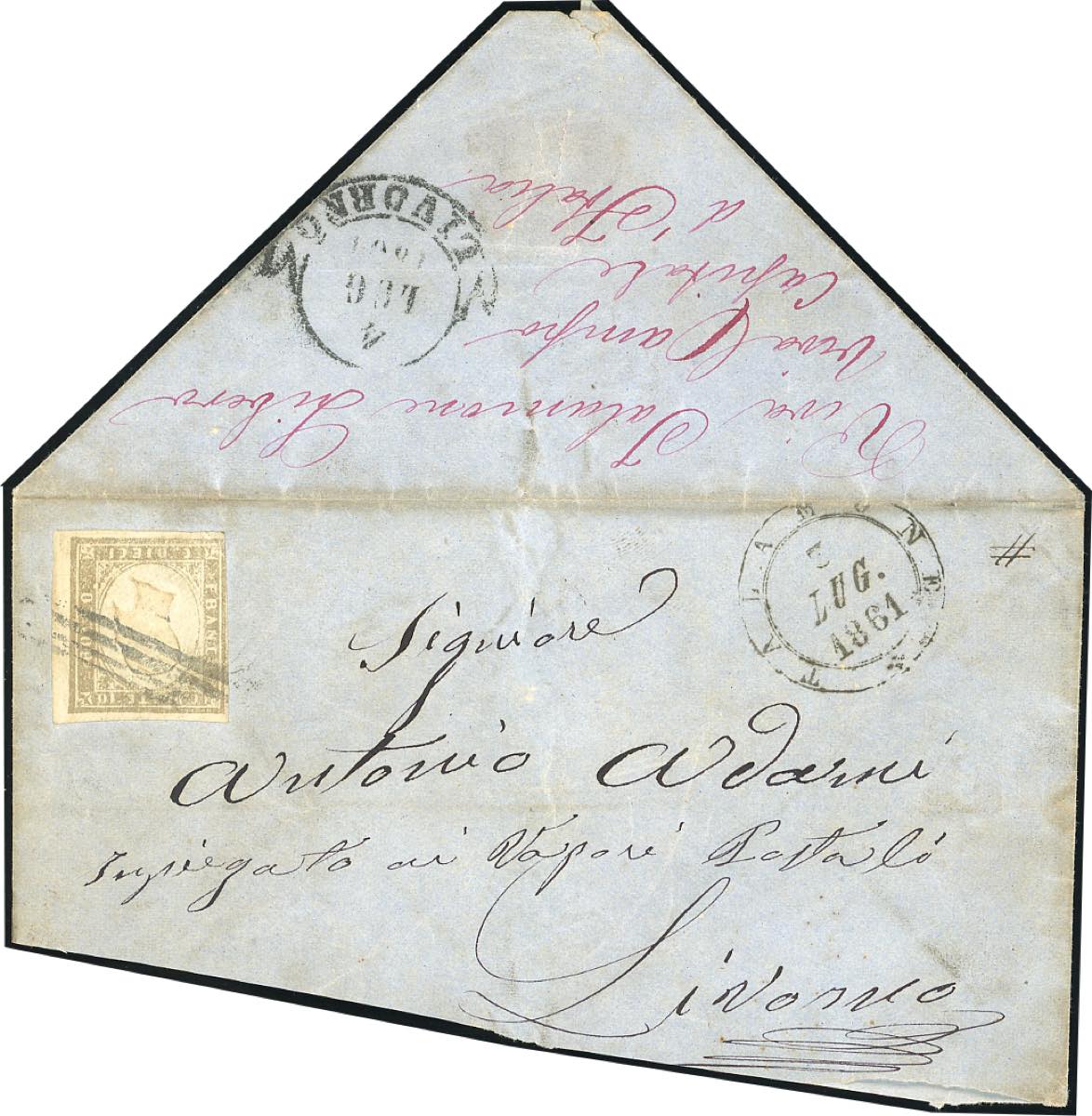 TALAMONE, doppio cerchio + muto di Grosseto - 10 cent. della IV di Sardegna (14Cd), corto a sinistra, su gran parte di lettera da Talamone 3/7/1861 a Livorno. Il francobollo, non annullato in partenza, è stato annulllato in transito a Grosseto. Al verso manoscritto "Viva Talamone libero, viva Campo Capitale d'Italia". Insieme unico ed inedito!