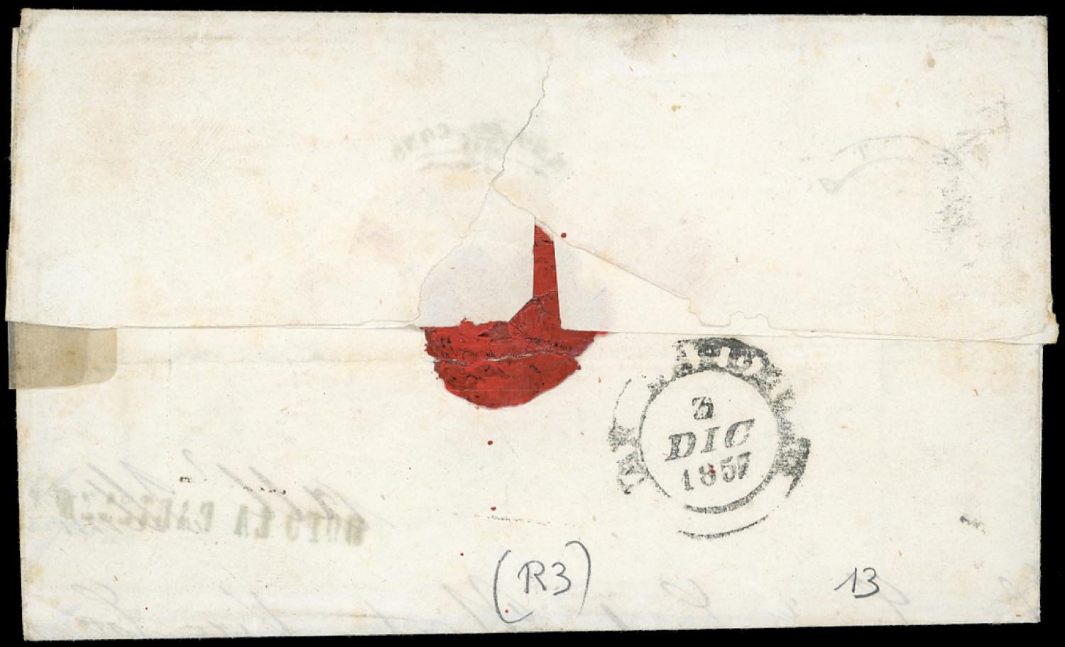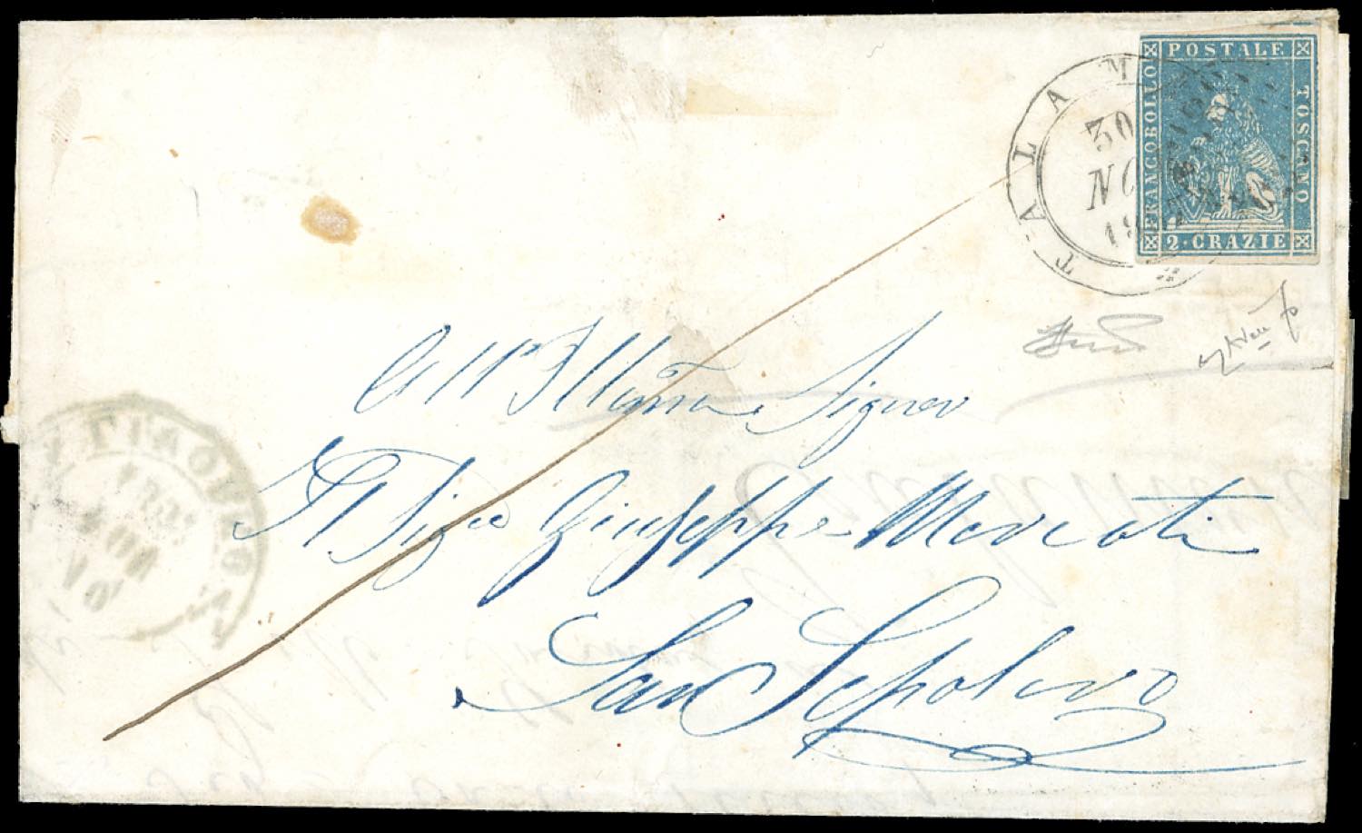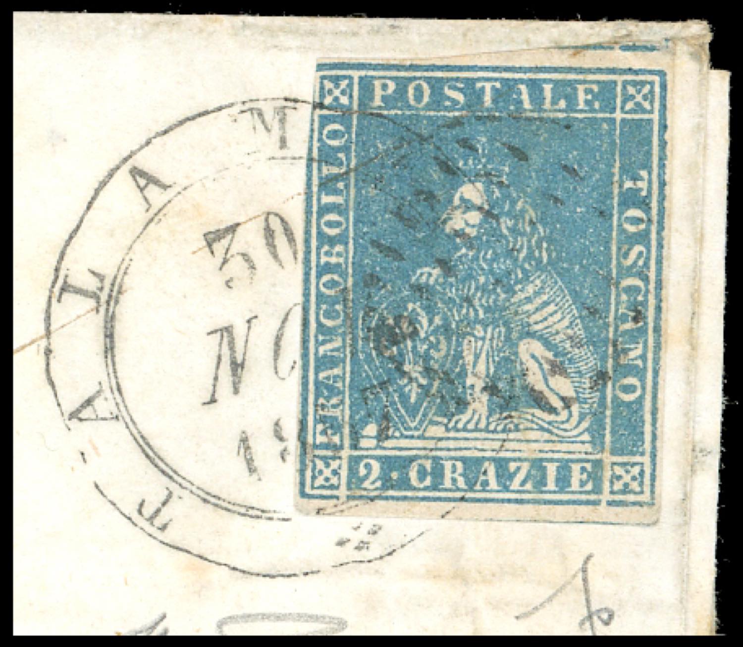 TALAMONE, doppio cerchio medio + muto a ovale di punti coannullatori punti R3 (Sassone 2020) - 2 crazie (13), tre buoni margini, leggermente intaccato a sinistra, su sovracoperta di lettera del 30/11/1857 per San Sepolcro. Rara combinazione di annulli, ad oggi inedita. Unica nota! Ferrario, cert. Avanzo. (Cat.Sassone €33.750/75.000).