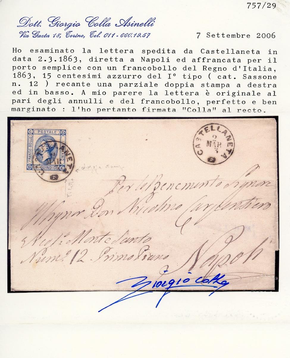 1863 - 15 cent. Litografico, I tipo, doppia stampa parziale in basso e a destra (12d), perfetto, su sovracoperta di lettera da Castellaneta 2/3/1863 a Napoli. Molto rara! Ferrario, cert. Colla e Sorani.