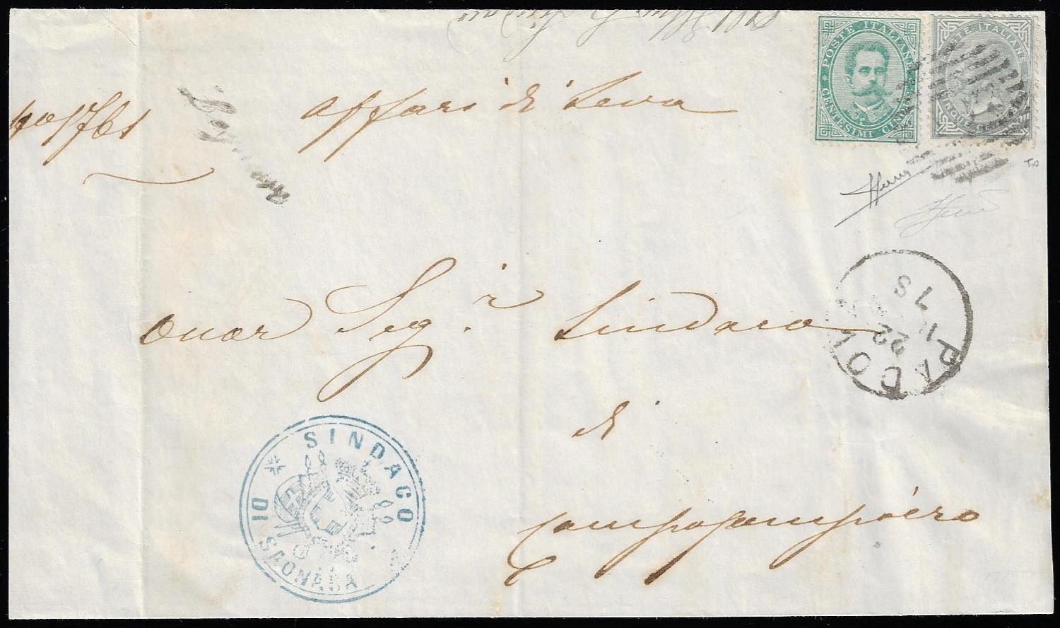1879 - 5 cent. De La Rue, tiratura di Torino e 5 cent. Umberto I (T16,37), perfetti, su sovracoperta di lettera da Legnaro (corsivo di ... Read more