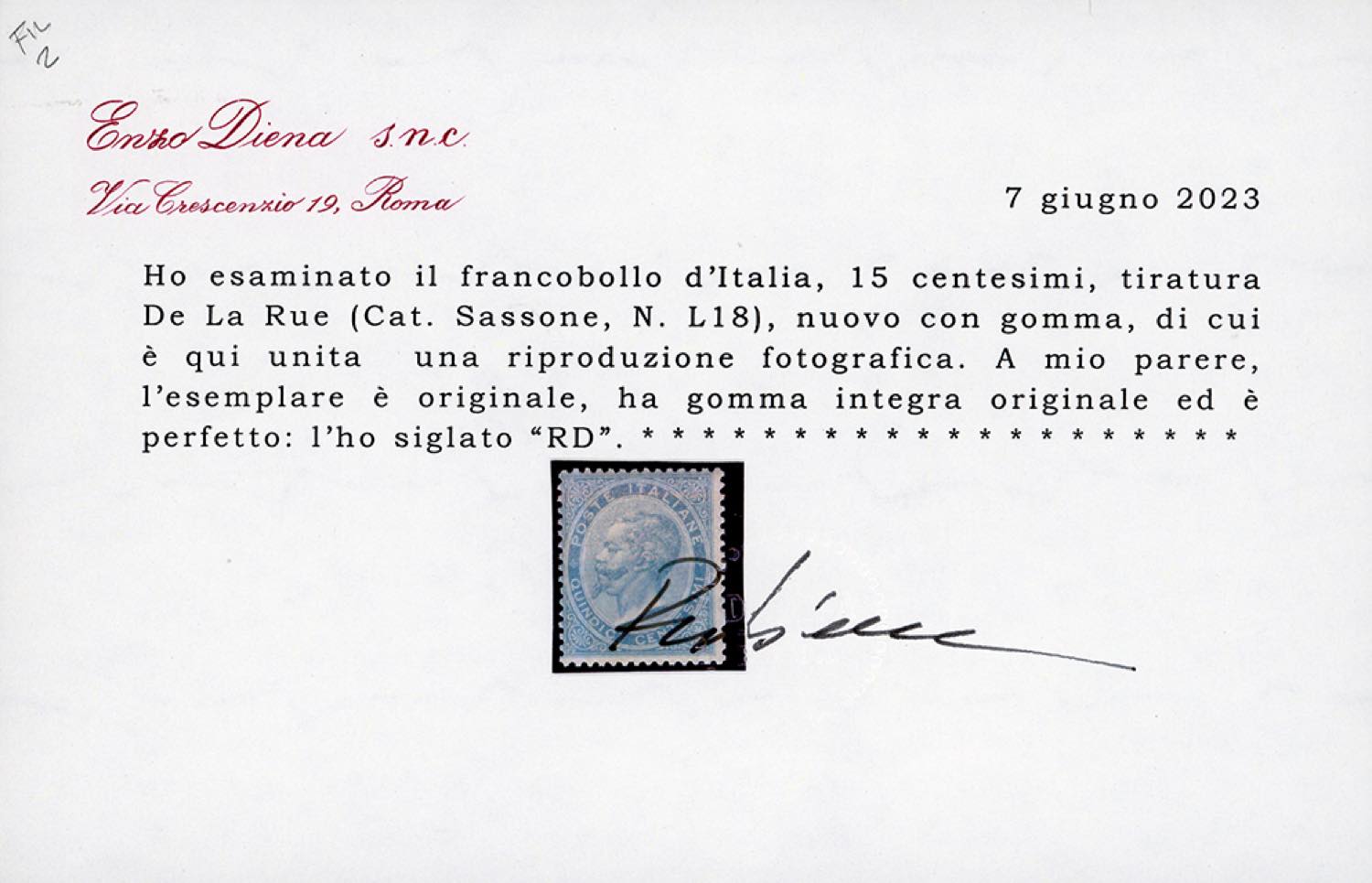 1863 - 15 cent. De La Rue (L18), gomma originale integra, perfetto. E.Diena, Ferrario, cert. Diena.