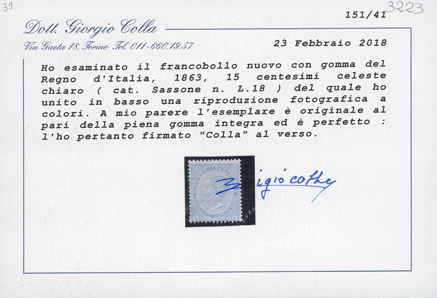 1863 - 15 cent. De La Rue (L18), nuovo, gomma originale integra, perfetto. Molto fresco e buona centratura. Cert. Colla.