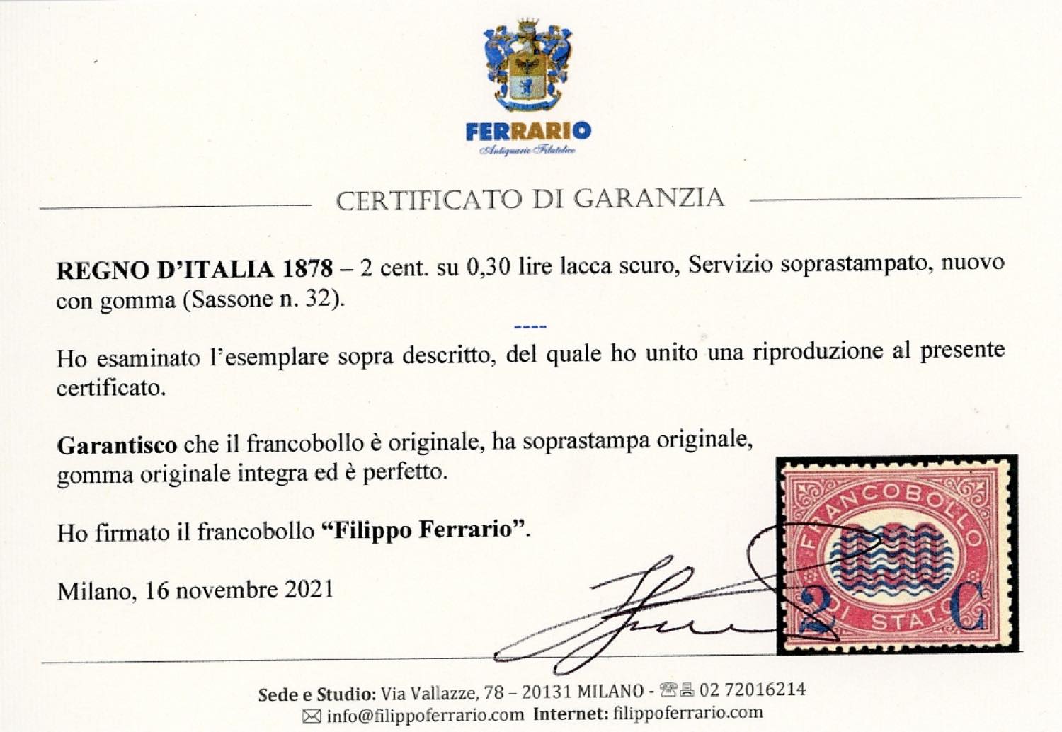 1878 - 2 cent. su 0,30 lire Servizio soprastampati (32), discreta centratura, gomma originale integra, perfetto. Molto fresco. Cert. Ferrario.