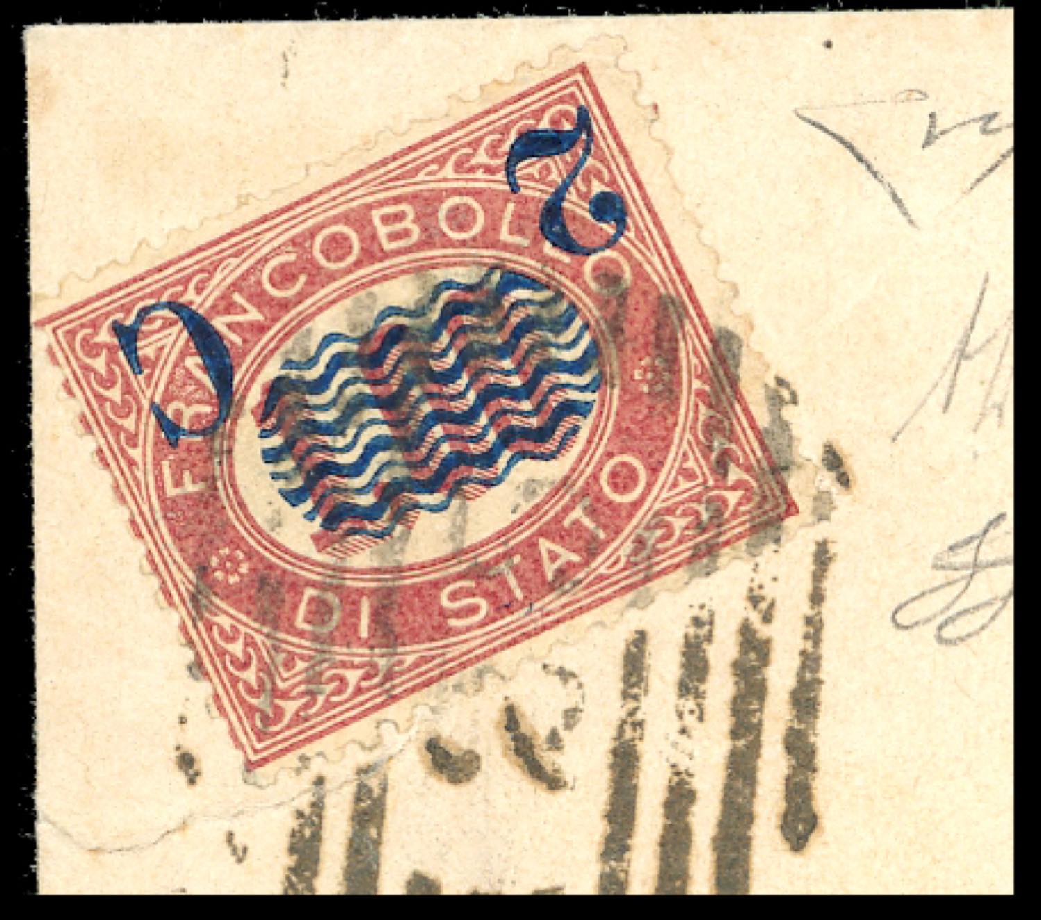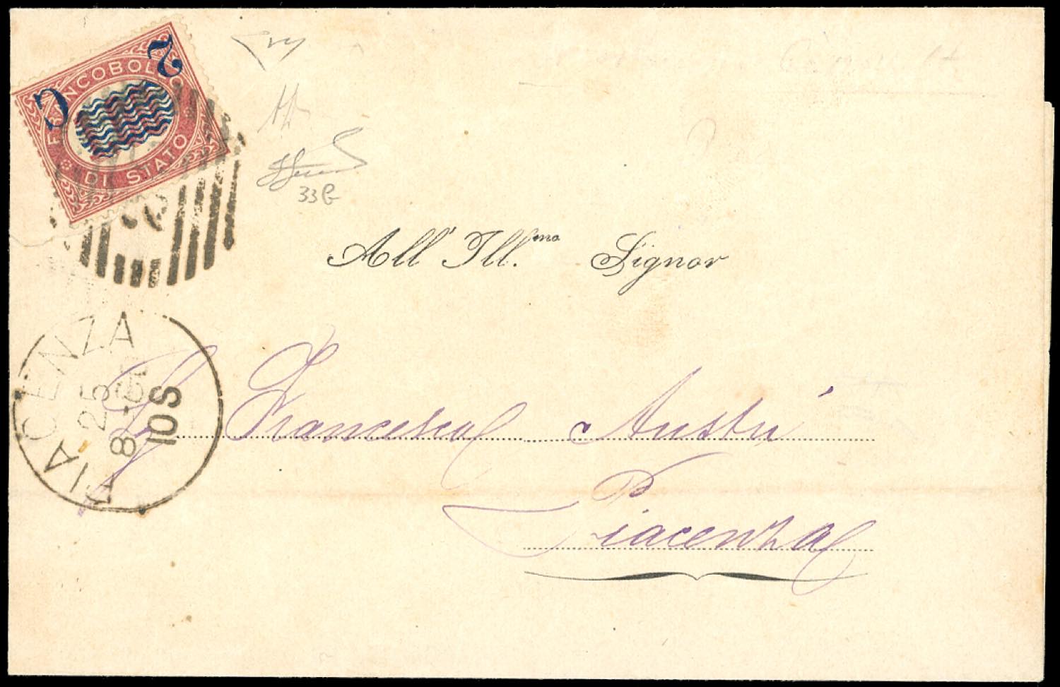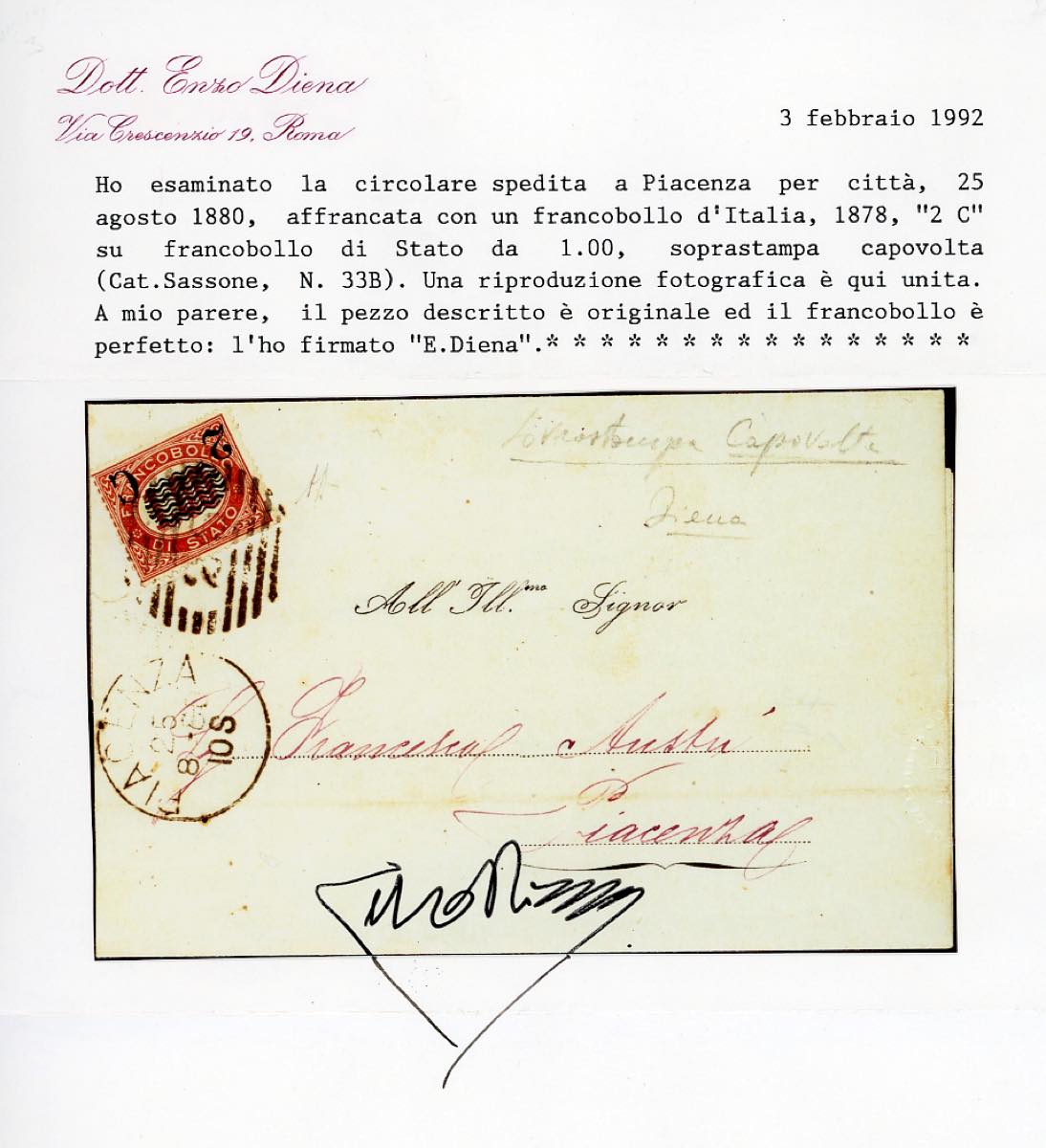 1880 - 2 cent. su 1 lira Servizio soprastampati, soprastampa capovolta (33b), perfetto, su circolare da Piacenza 25/8/1880 per città. Molto rara! A.Diena, Ferrario, cert. Diena.