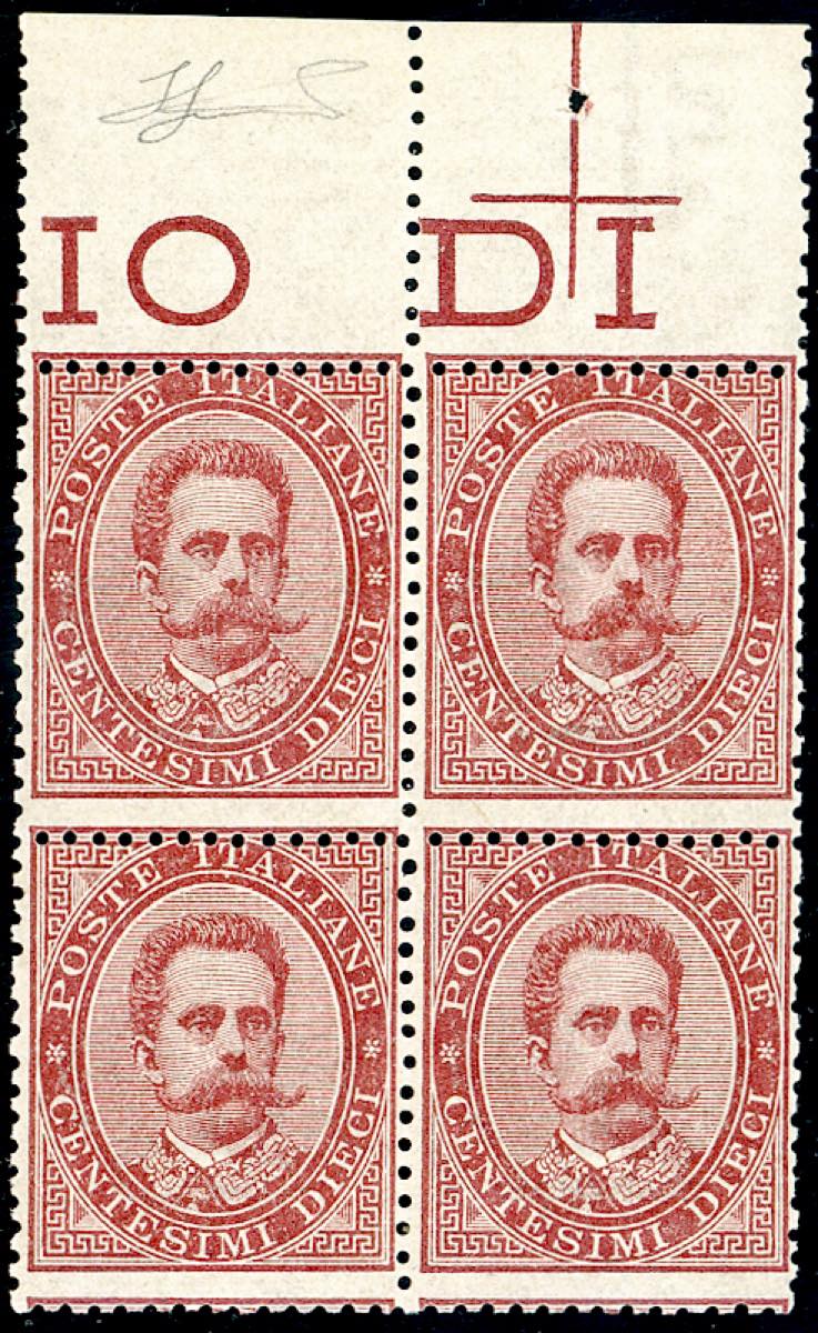 Lot 1143 - 1879 - 10 cent. Umberto I (38), blocco di quattro, bordo di ...