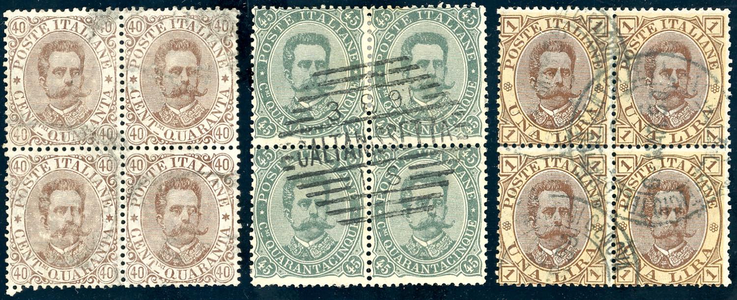 1889 - 40 cent., 45 cent., 1 lira Umberto I (45,46,48), blocchi di quattro, usati, perfetti. Non comuni. Cert. Colla per il primo, firma G.Oliva e Ferrario per gli altri.