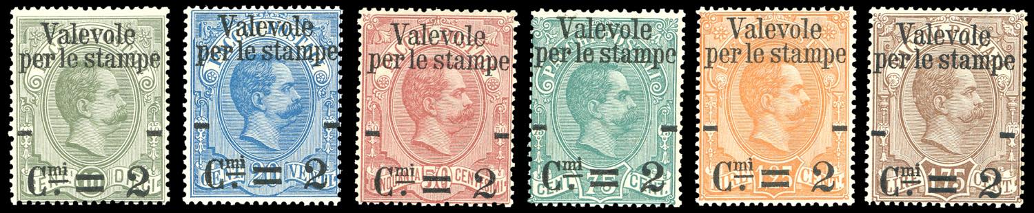 1890 - Valevole per le stampe, serie completa (50/55), discreta centratura, gomma originale integra, perfetti e molto freschi.