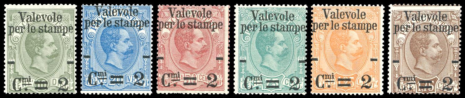 1890 - Valevole per le stampe, serie completa (50/55), nuovi, gomma originale integra, perfetti e molto freschi. Ferrario.
