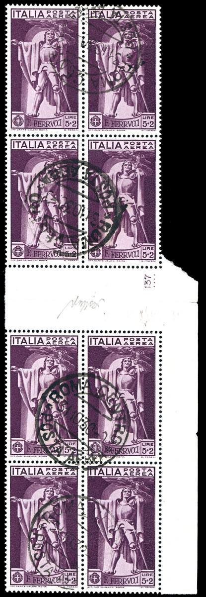 1930 - 5 + 2 lire Ferrucci (20), blocco di 8 con interspazio di gruppo al centro, mostrante il numero di cilindro "137", perfetto, usato a Roma 31/10/1930. Raro. Cert. Caffaz.