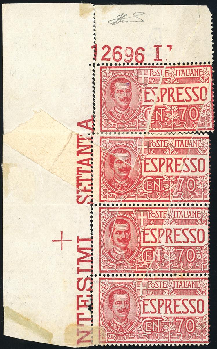 1925 - 70 cent. (11), striscia verticale di quattro esemplari con stampa su carta ricongiunta, angolo di foglio con numero di tavola, il ... Read more