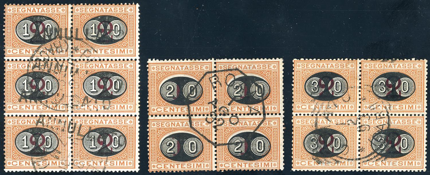 1890/91 - Mascherine, serie completa (17/19), blocchi di quattro, di sei per il 10 cent. su 2 cent., usati, perfetti. Non comuni. E.Diena ... Read more