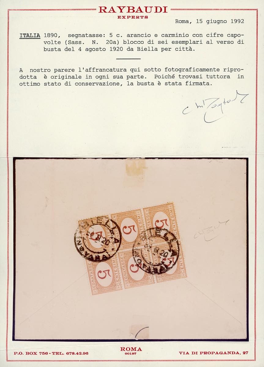 1920 - 5 cent. arancio e carminio, cifra capovolta (20a), blocco di sei, perfetto al verso di busta da Biella 4/8/1920 per città. Unica nota, rarità del settore. Ferrario, cert. Raybaudi.