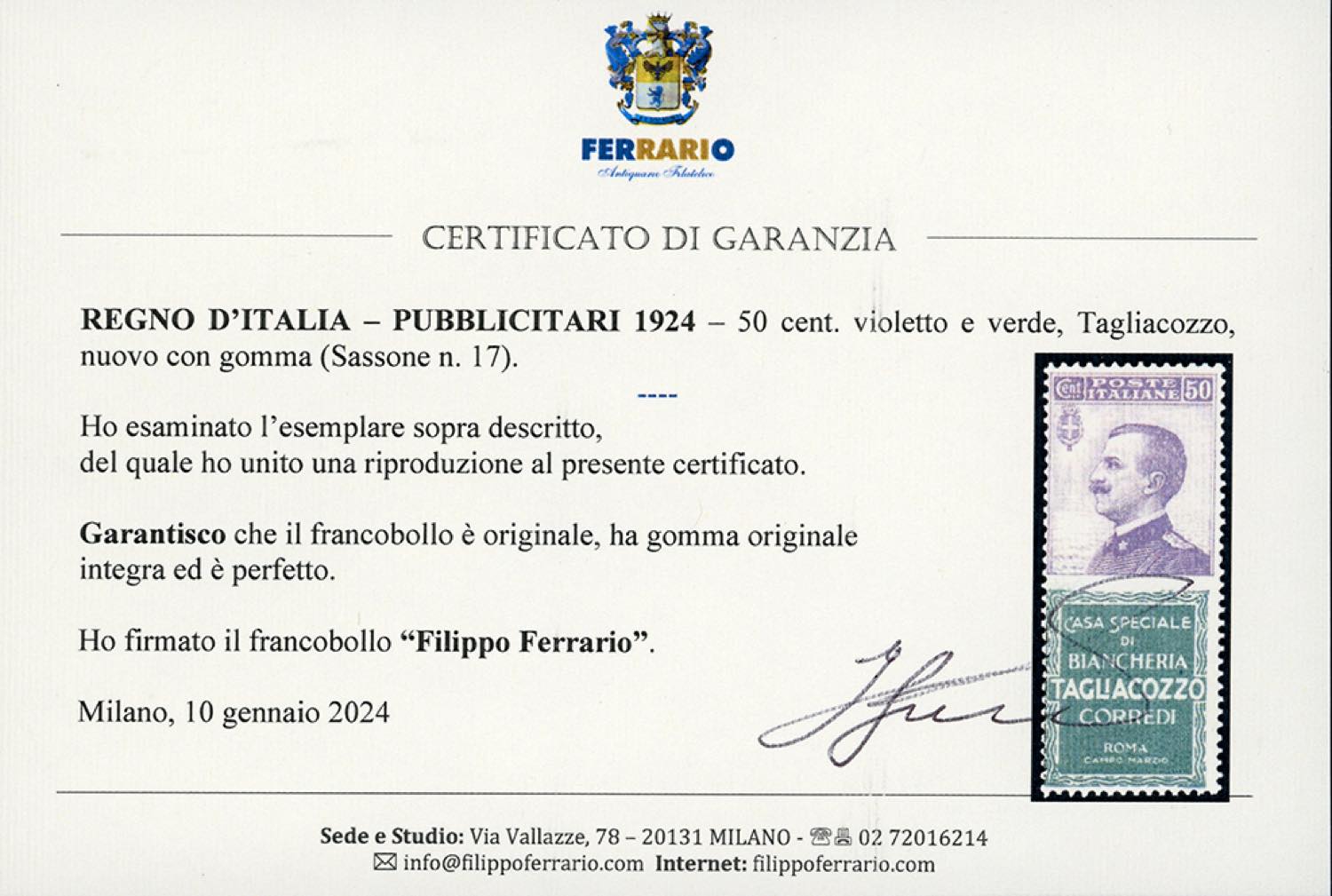 Lot 1573 - 1924 - 50 cent. Tagliacozzo (17), gomma originale integra, ...