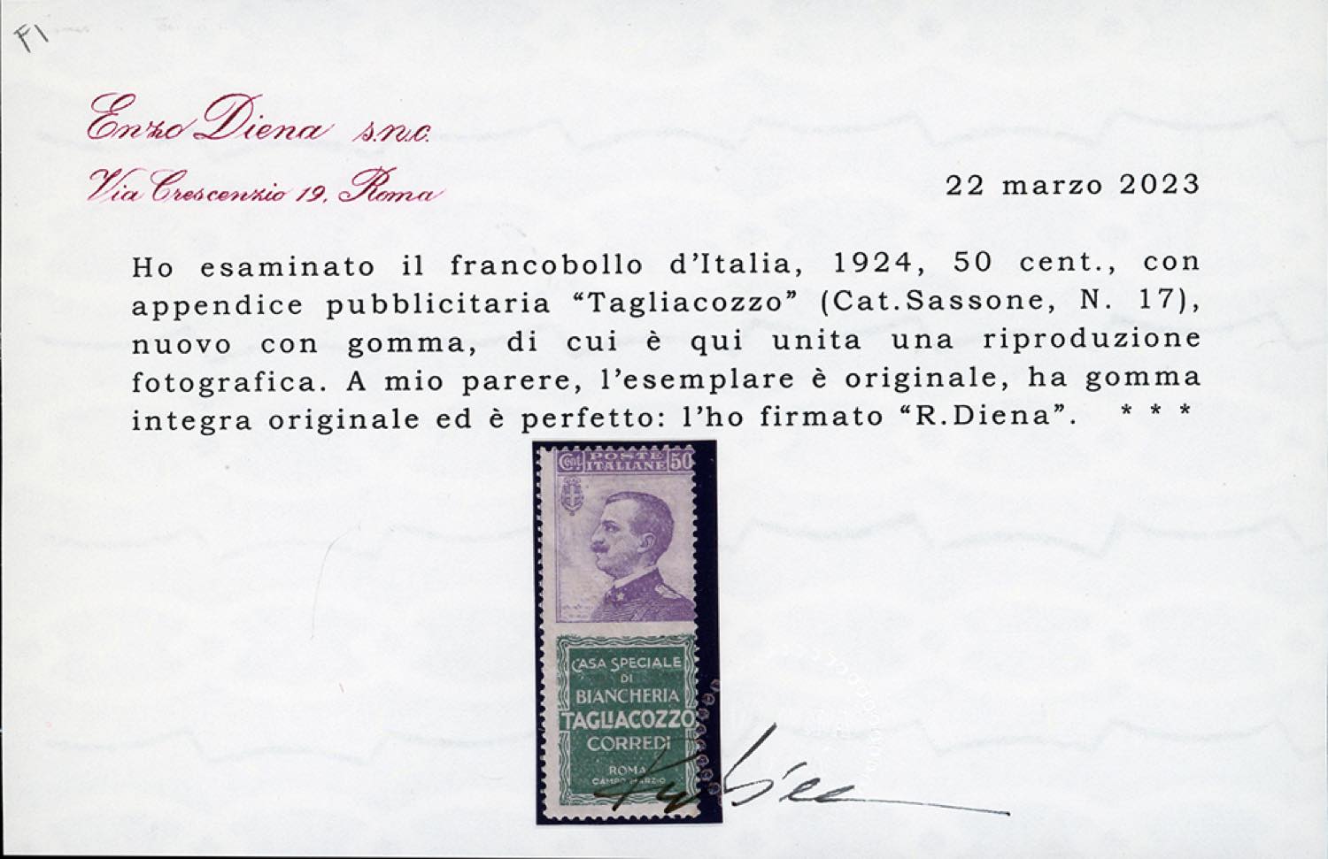 Lot 1574 - 1924 - 50 cent. Tagliacozzo (17), gomma originale integra, ...