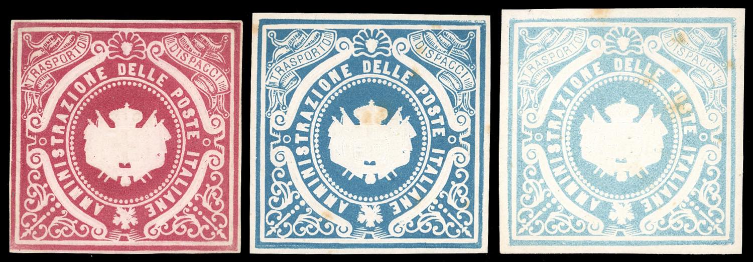 1863 - Suggello gommato delle poste, "trasporto dispacci", saggi non adottati in tre colori differenti, di grande formato, gomma originale, perfetti. Non comuni. Ferrario.