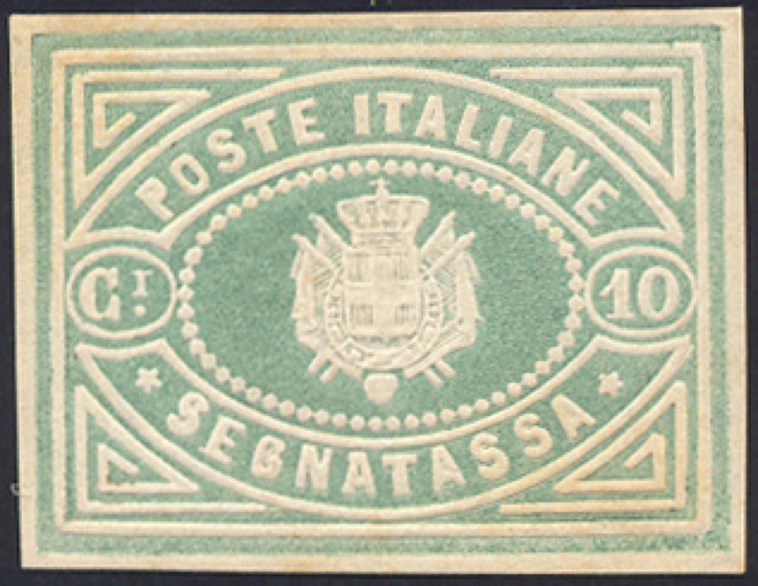 Lot 1643 - 1864 - 10 cent. Saggio Re, segnatasse, verde chiaro, gomma ...