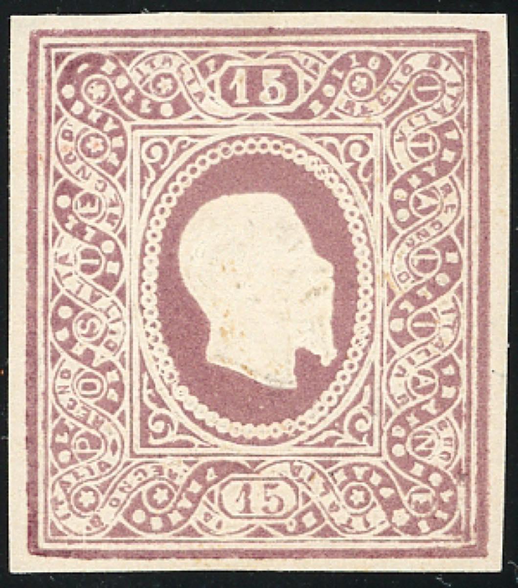 Lot 1644 - 1864 - 15 cent. Saggio Re, ovale riquadrato, bruno porpora ...