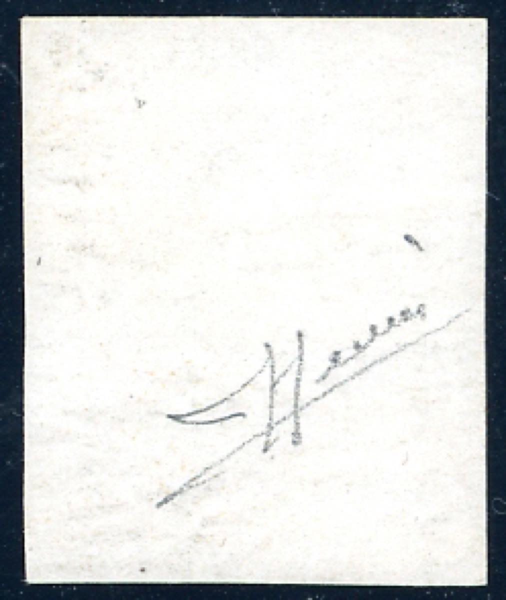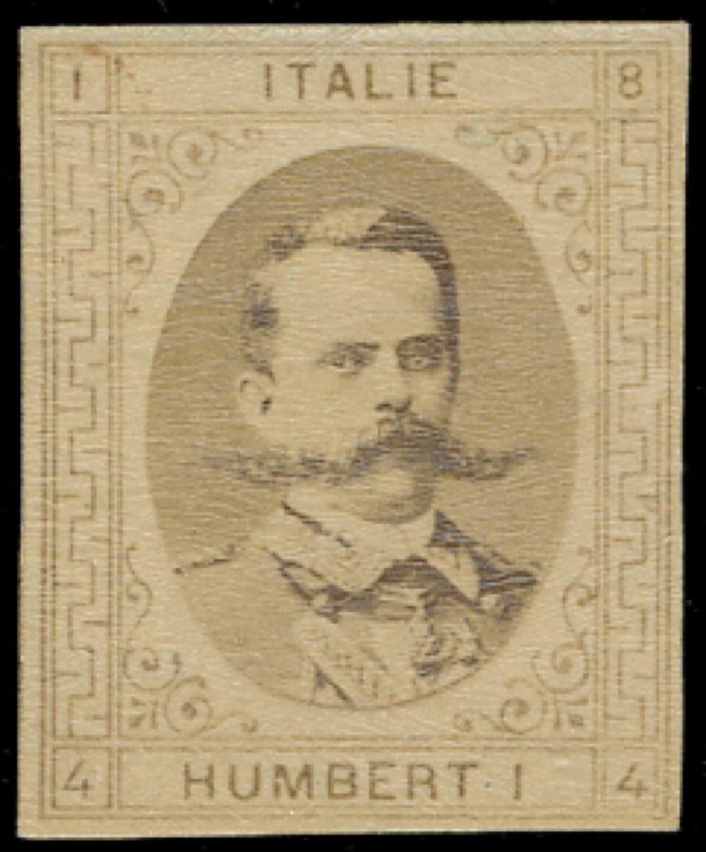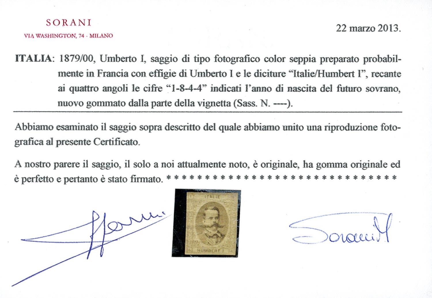 1879/1900 - Saggio fotografico color seppia, predisposto probabilmente in Francia, con effigie di Umberto I e le diciture "Italie/Humbert I", recante ai quattro angoli le cifre "1-8-4-4", indicanti l'anno di nascita del sovrano, gommato dalla parte della vignetta, perfetto. UNICO ESEMPLARE NOTO. Cert. Sorani.