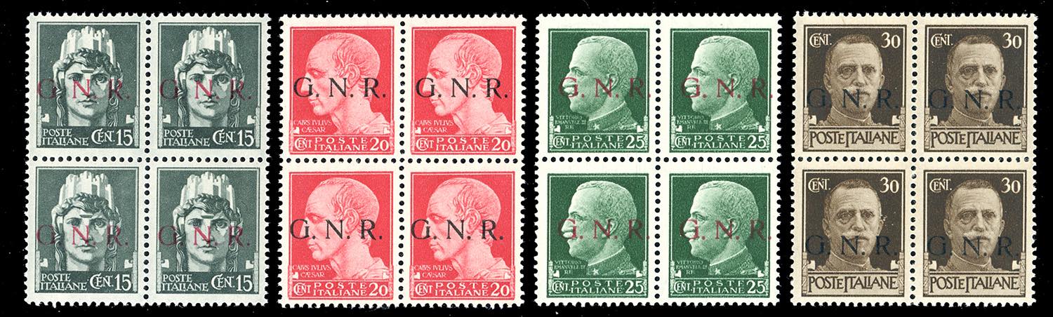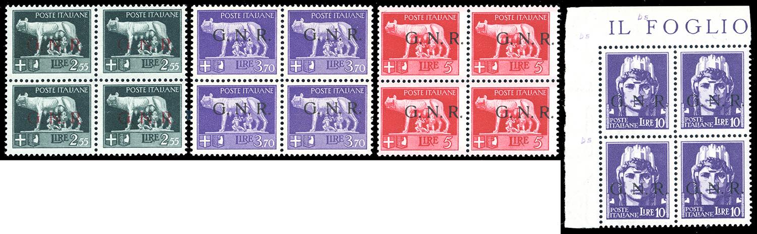 1943 - Soprastampati G.N.R., tiratura di Brescia, I tipo, serietta di 16 valori (470/I-480/I,482/I-486/I), blocchi di quattro, diversi angolo/bordo di foglio, gomma originale integra, perfetti e di ottima qualità. Cert. Sirotti per i 7 alti valori.