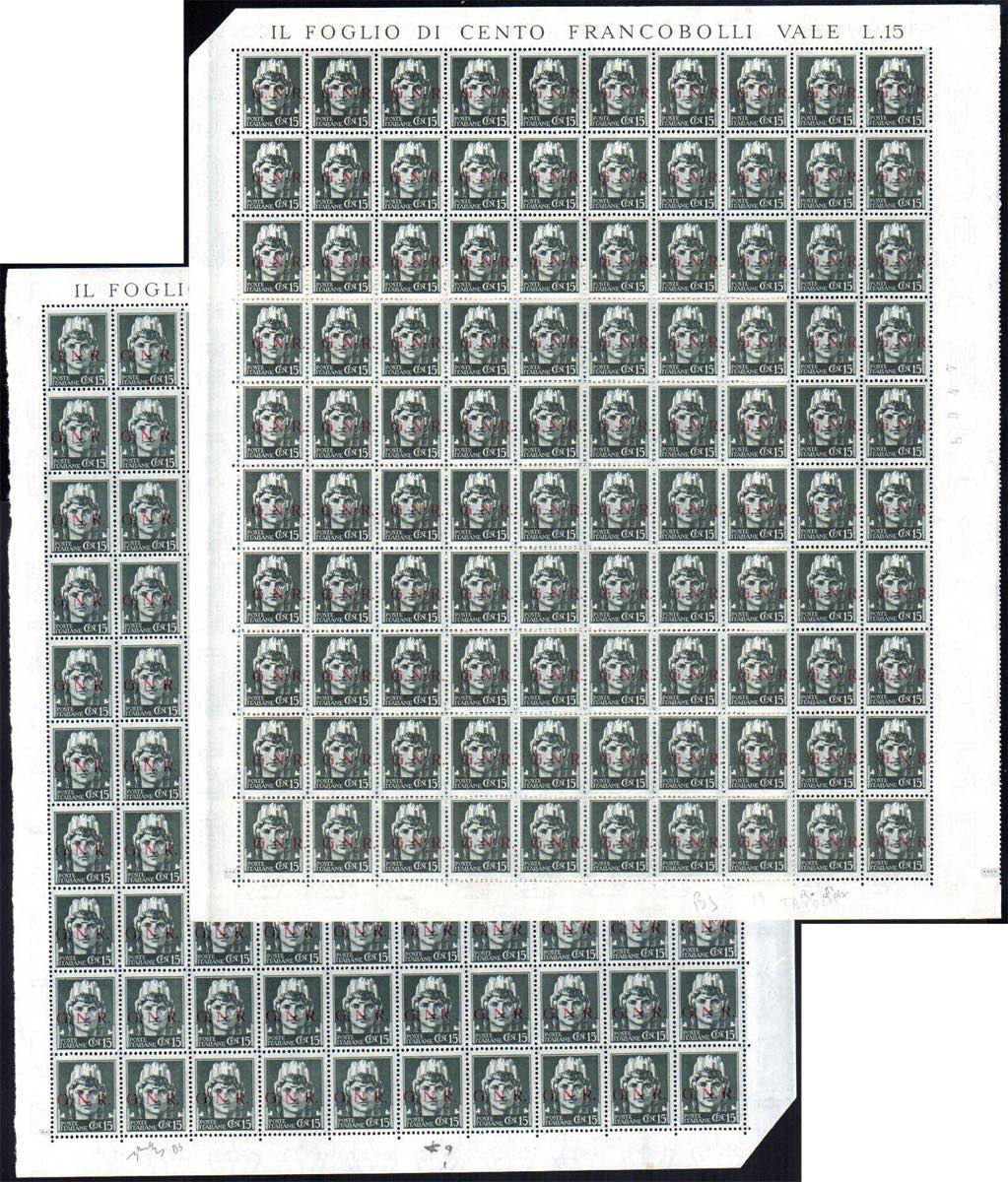 1943 - 15 cent. soprastampa G.N.R. di Brescia (472/I), due fogli completi di 100 esemplari, metà di sinistra e di destra della tavola, comprendenti le varietà costanti, gomma integra, perfetti. Molto belli e di grande interesse per lo studio e la plattatura delle tavole.