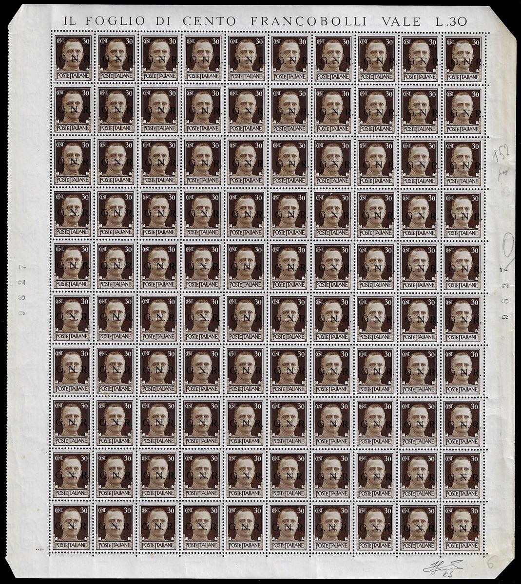 1943 - 30 cent. bruno, soprastampa G.N.R. di Brescia, I tipo (475/I), foglio di 100, nuovo, gomma originale integra, perfetto. Notate alcune varietà di pregio non conteggiate, tra cui "R" accostata a "N". Non comune. Ferrario.