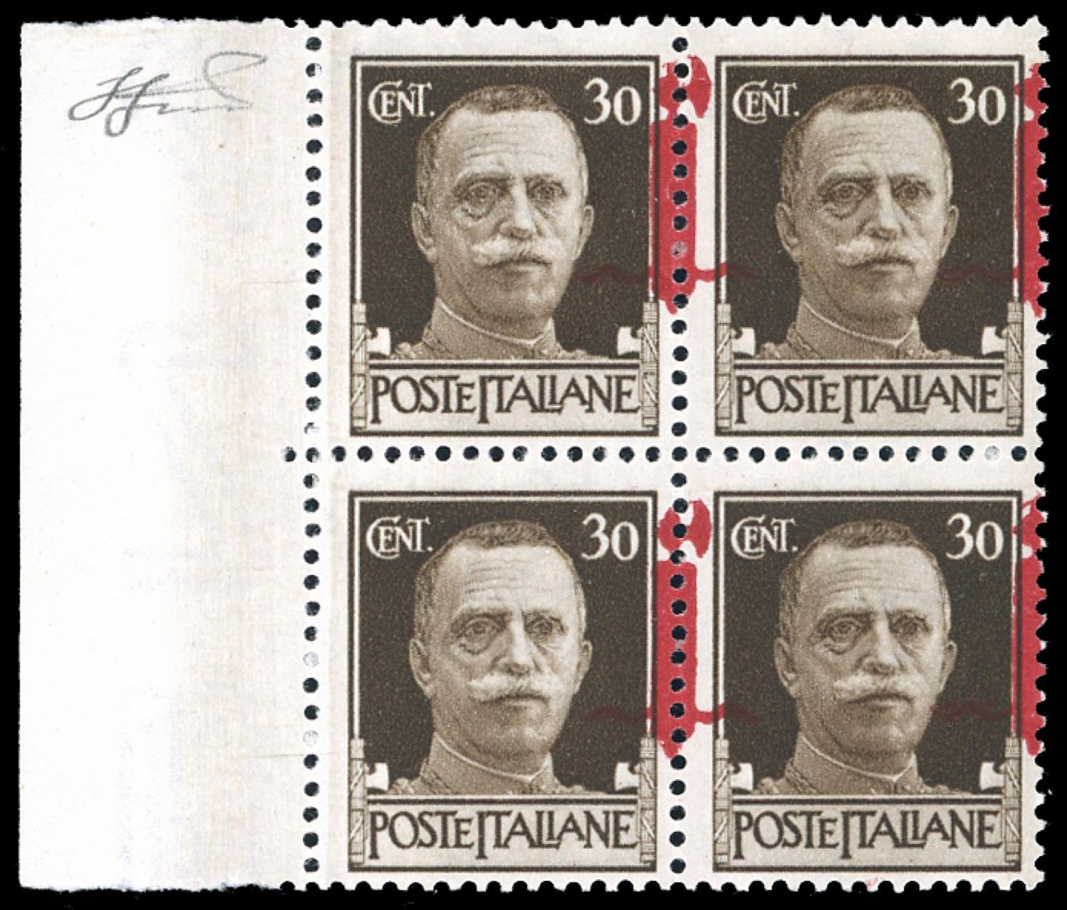 1944 - 30 cent. soprastampa fascio in rosso di Firenze fortemente spostata in senso orizzontale (492/II pm), blocco di 4, bordo di foglio, gomma originale integra, perfetto. Chiavarello, Ferrario.