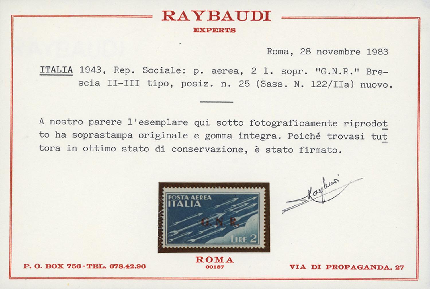 1943 - 2 lire azzurro, soprastampa G.N.R. di Brescia, "GN" del II tipo, "R" del III (122/IIa), gomma originale integra, perfetto, gomma leggermente scura. Raro. Cert. Raybaudi.