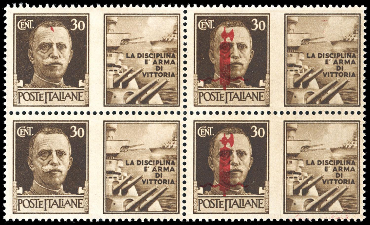 1944 - 30 cent. Marina soprastampato fascio, blocco di 4, i due esemplari di sinistra senza soprastampa (29c), gomma originale integra, perfetti, lievi ossidazioni al verso di due esemplari. Molto raro. Ferrario.