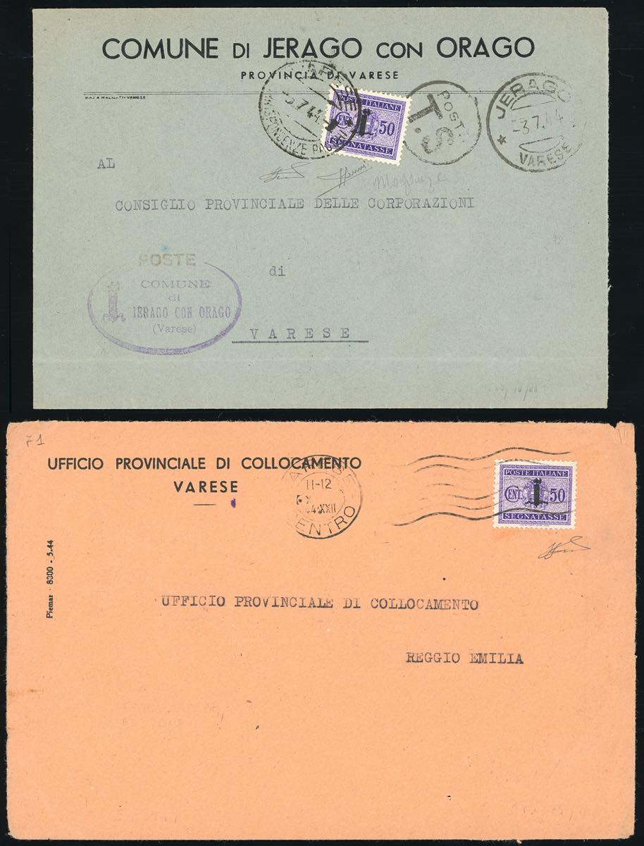 1944 - 50 cent. soprastampato fascetto (66), due esemplari perfetti, uno usato come francobollo su busta da Varese 9/8/1944 per Reggio Emilia, un altro usato come come segnatasse su busta da Jerago 3/7/1944 per Varese. Non comuni. Sorani, Ferrario.