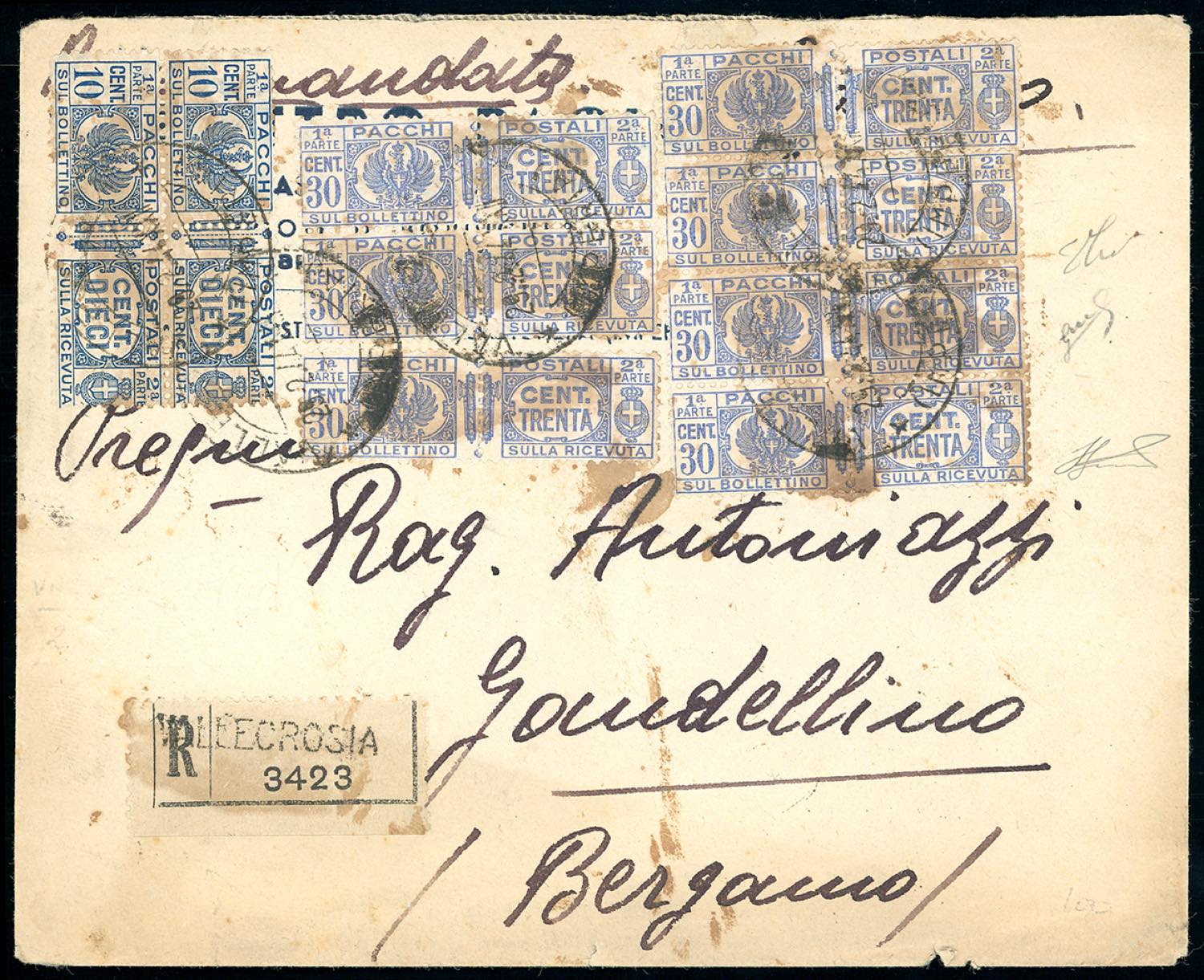 1944 - 10 cent., coppia, 30 cent., sette esemplari, pacchi postali di Regno, fasci al centro (25,27), su busta raccomandata da Vallecrosia 29/2/1944 a Gandellino, bollo d'arrivo. Rara affrancatura d'emergenza non filatelica, composta solo da esemplari per pacchi postali. Ferrario.