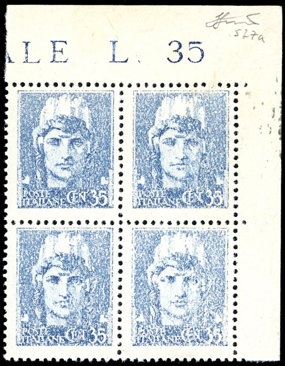 1945 - 35 cent., emissione di Novara, stampa evanescente (527a), blocco di quattro, angolo di foglio, gomma originale integra, traccia di ... Read more