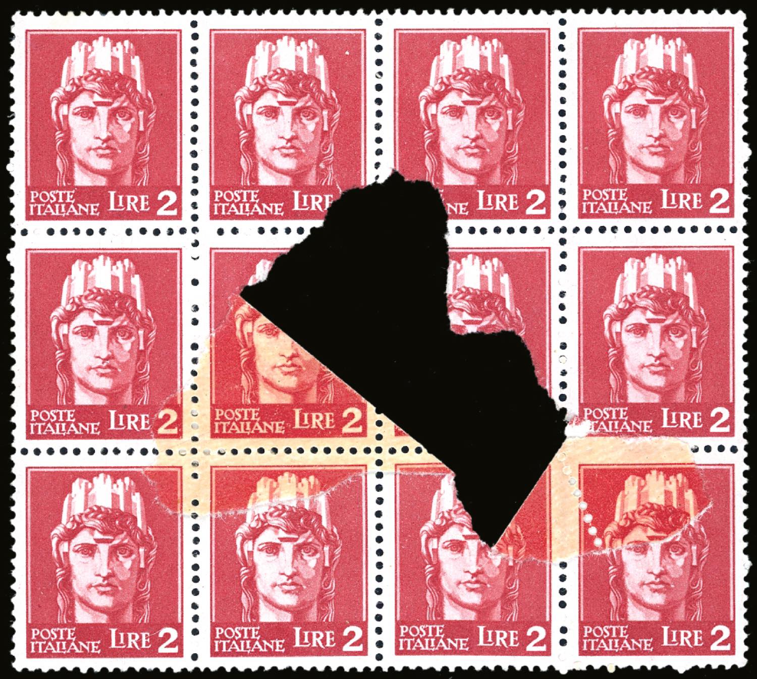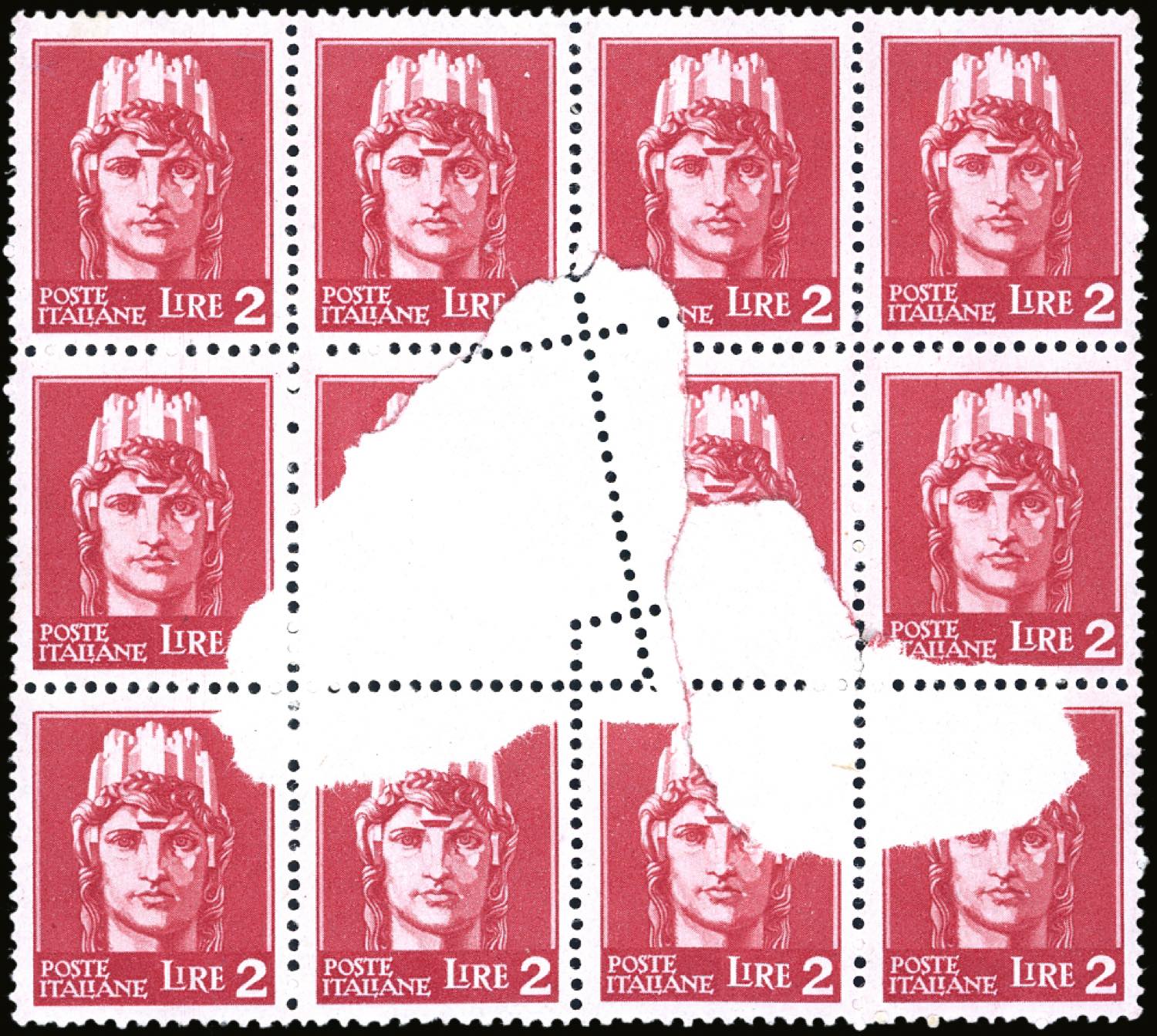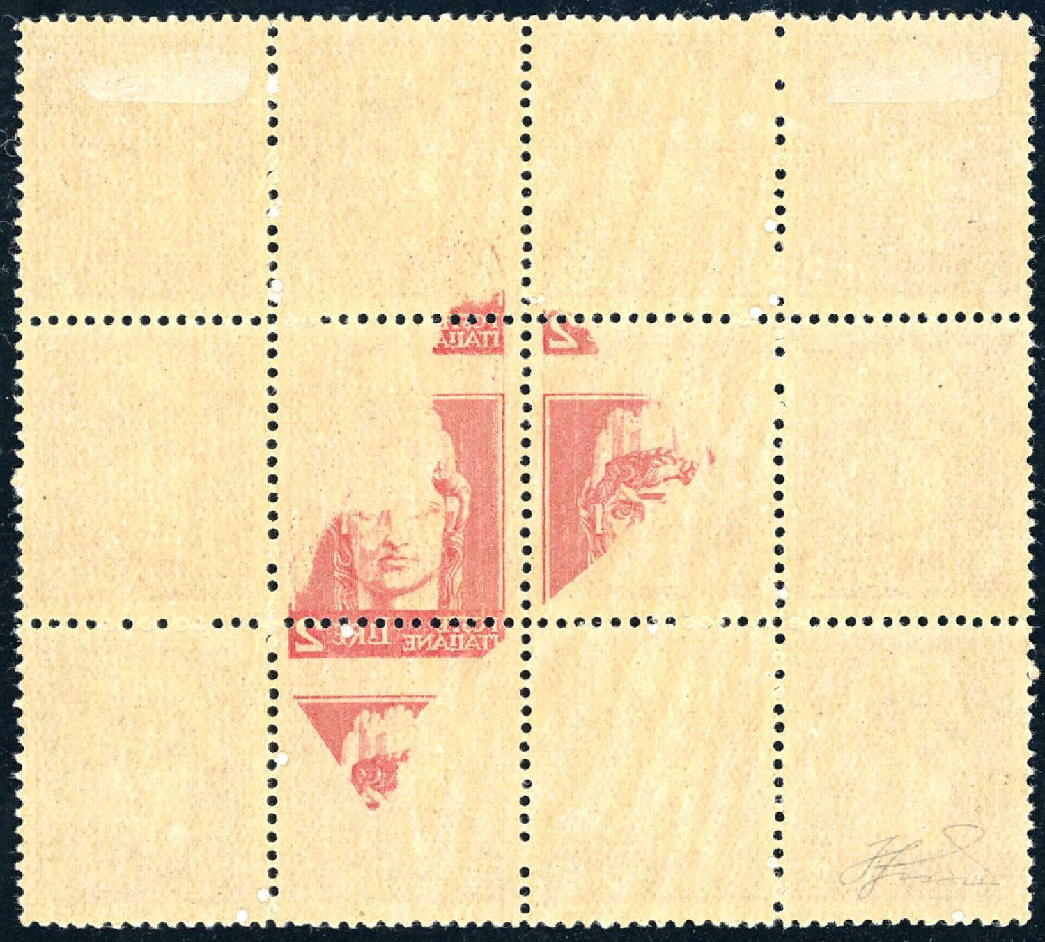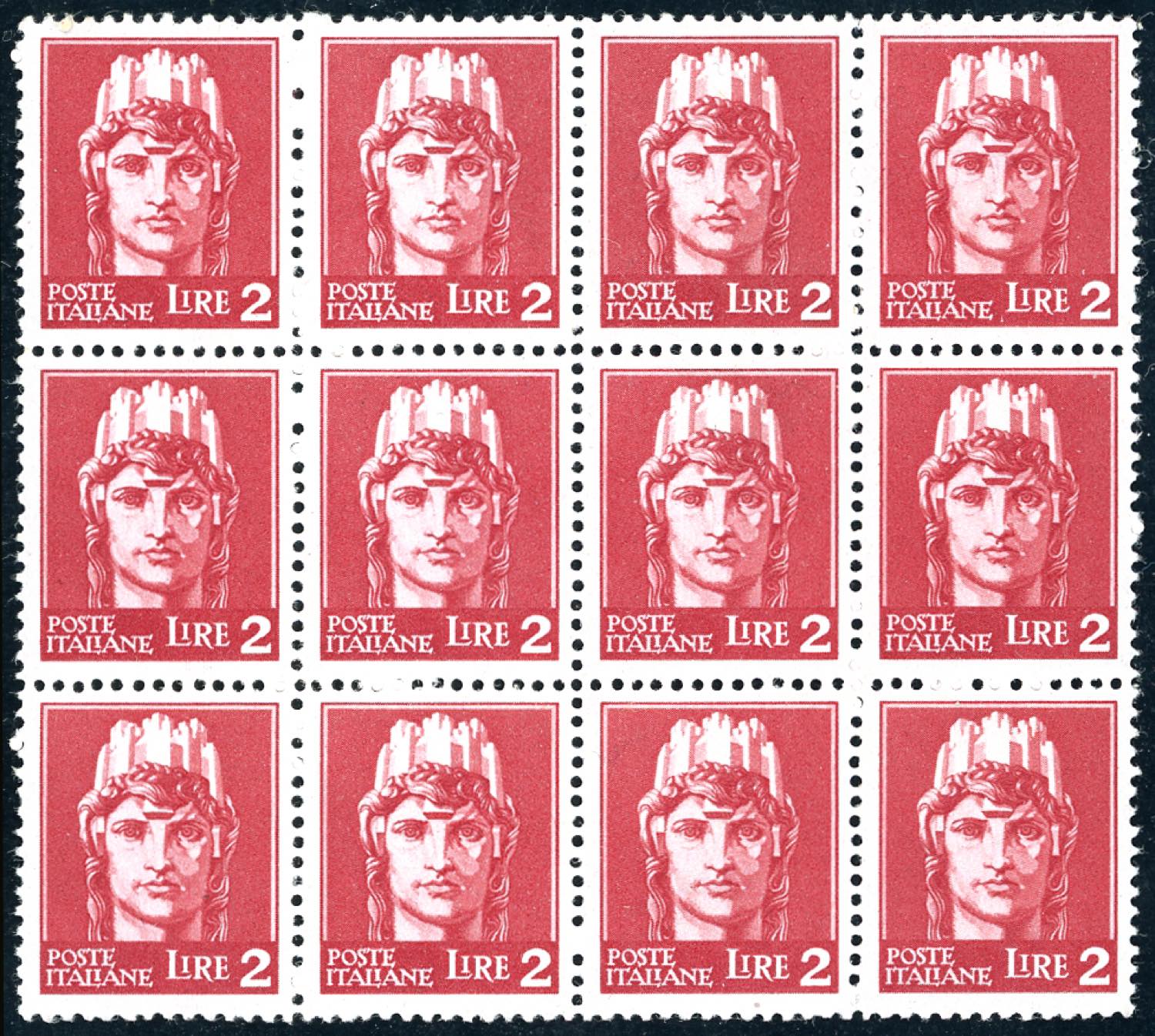 1945 - 2 lire, tiratura di Novara (541), eccezionale insieme composto da due blocchi di dodici esemplari, gomma integra, tre esemplari linguellati. Il primo blocco presenta un'ampia rottura della carta al centro, con sei esemplari stampati su carta ricongiunta, la parte mancante compare sotto forma di decalco, al verso del secondo blocco. Insieme straordinario ed unico, di grande impatto visivo. Ferrario.