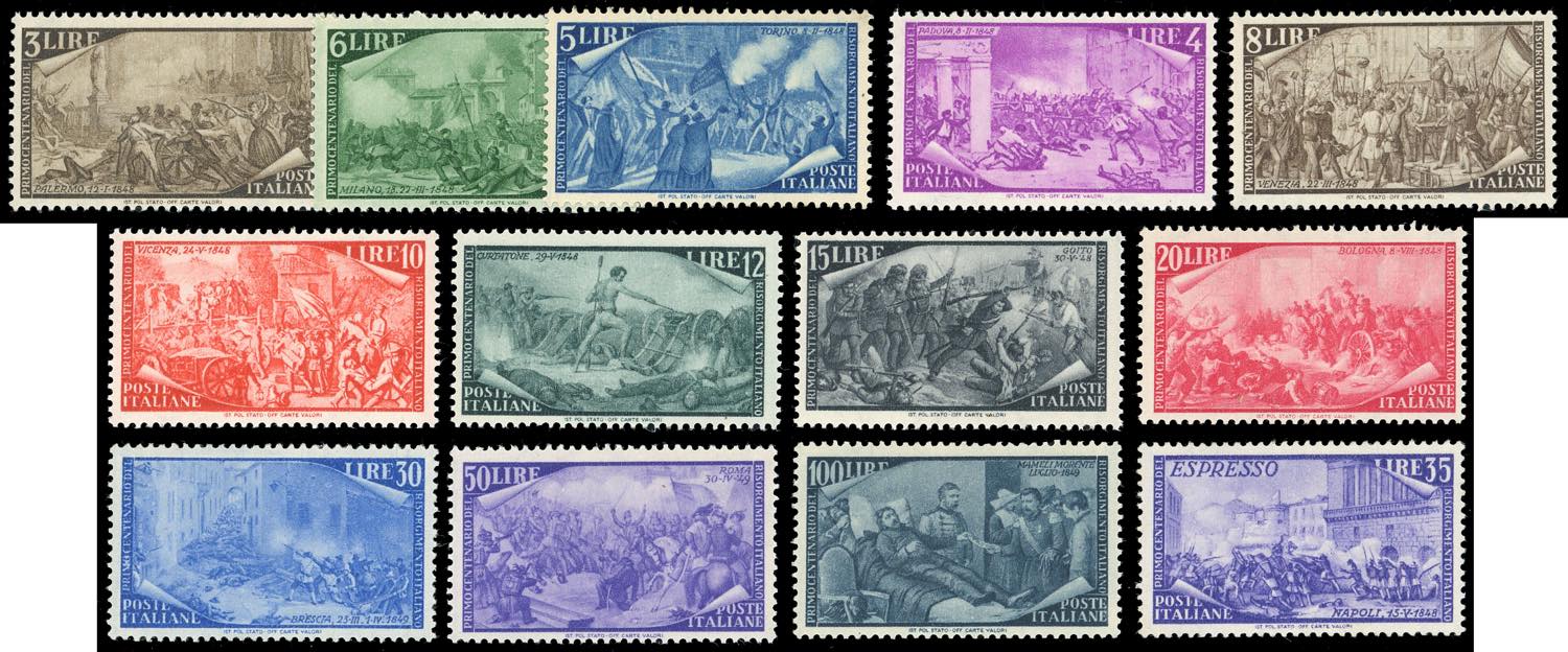 1948 - Risorgimento, serie completa (580/591+E), buona/ottima centratura, gomma originale integra, perfetti. Ferrario per gli alti valori.
