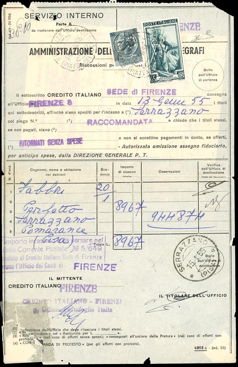 1955 - 5 lire Siracusana, 65 lire Lavoro, entrambi filigrana ruota e perfin CI (650,710), perfetti, su modulo per riscossione conto terzi ... Read more
