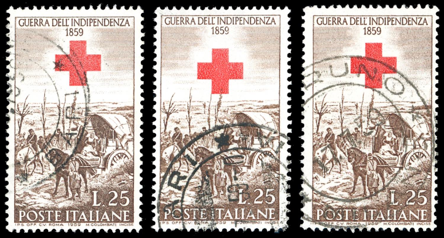 1959 - 25 lire II Guerra d'Indipendenza, croce fortemente spostata in basso (867d), tre esemplari usati, perfetti.