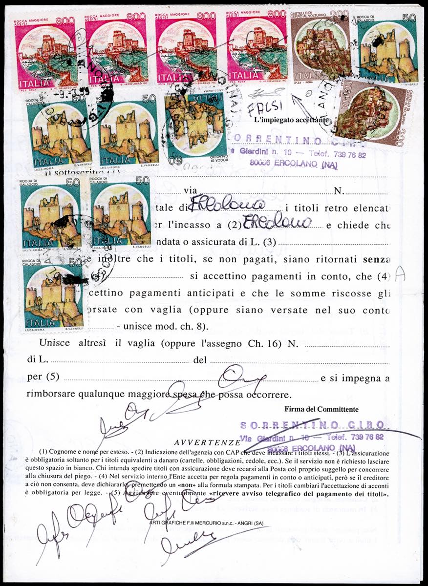 1999 - 800 lire Castelli (1525), falso per posta di Napoli, due coppie, con complementari (1508,1516/II), su modulo per servizio riscossione, annullati ad Ercolano 9/3/1999. Pregevole insieme. Ferrario.