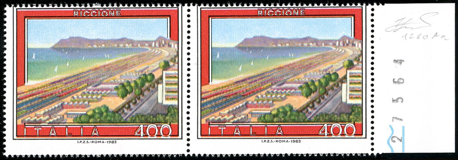 1983 - 400 lire Riccione, stampa di un colore e dentalletura orizzontale fortemente spostati (1648a), coppia nuova, bordo di foglio, gomma integra, perfetta. Ferrario.