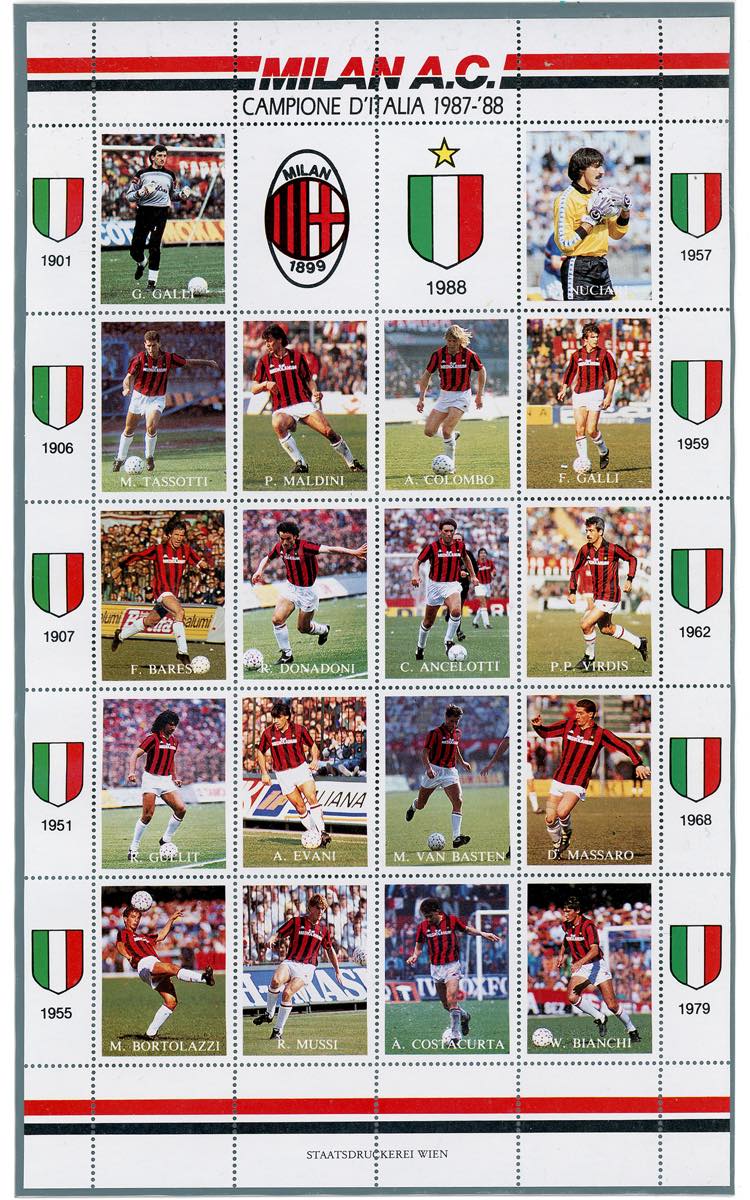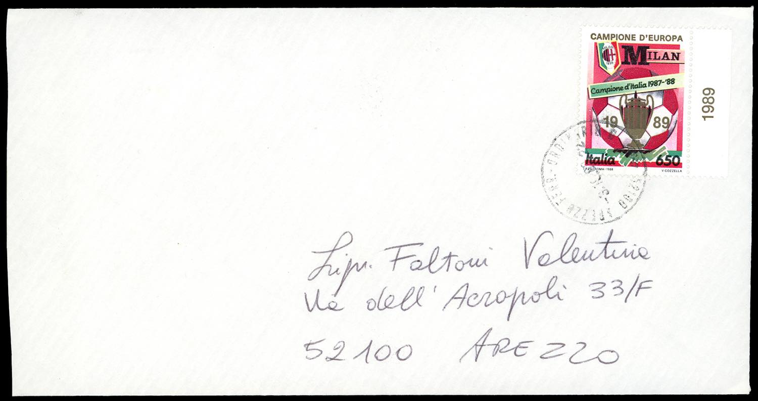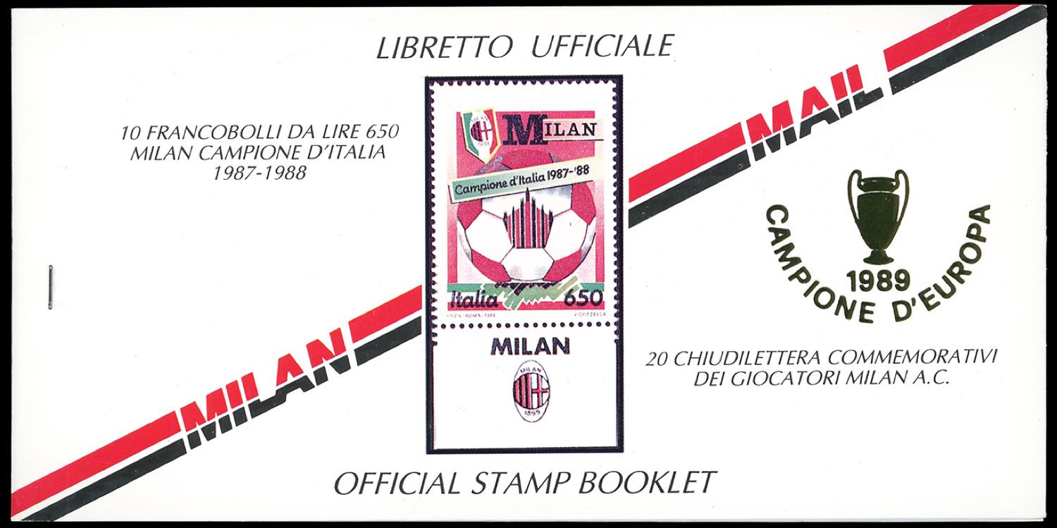 1989 - 650 lire Milan (1836), soprastampa in oro "Campione d'Europa", nuovo, gomma originale integra, e usato su busta, perfetti. Allegato il libretto ufficiale e un folder con il foglietto erinnofilo "Milan campione d'Italia 1987/88".